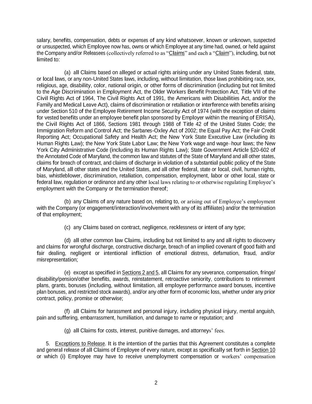 2 salary, benefits, compensation, debts or expenses of any kind whatsoever, known or unknown, suspected or unsuspected, which Employee now has, owns or which Employee at any time had, owned, or held against the Company and/or Releasees (collectively referred to as “Claims” and each a “Claim”), including, but not limited to: (a) all Claims based on alleged or actual rights arising under any United States federal, state, or local laws, or any non-United States laws, including, without limitation, those laws prohibiting race, sex, religious, age, disability, color, national origin, or other forms of discrimination (including but not limited to the Age Discrimination in Employment Act, the Older Workers Benefit Protection Act, Title VII of the Civil Rights Act of 1964, The Civil Rights Act of 1991, the Americans with Disabilities Act, and/or the Family and Medical Leave Act), claims of discrimination or retaliation or interference with benefits arising under Section 510 of the Employee Retirement Income Security Act of 1974 (with the exception of claims for vested benefits under an employee benefit plan sponsored by Employer within the meaning of ERISA), the Civil Rights Act of 1866, Sections 1981 through 1988 of Title 42 of the United States Code; the Immigration Reform and Control Act; the Sarbanes-Oxley Act of 2002; the Equal Pay Act; the Fair Credit Reporting Act; Occupational Safety and Health Act; the New York State Executive Law (including its Human Rights Law); the New York State Labor Law; the New York wage and wage–hour laws; the New York City Administrative Code (including its Human Rights Law); State Government Article §20-602 of the Annotated Code of Maryland, the common law and statutes of the State of Maryland and all other states, claims for breach of contract, and claims of discharge in violation of a substantial public policy of the State of Maryland, all other states and the United States, and all other federal, state or local, civil, human rights, bias, whistleblower, discrimination, retaliation, compensation, employment, labor or other local, state or federal law, regulation or ordinance and any other local laws relating to or otherwise regulating Employee’s employment with the Company or the termination thereof; (b) any Claims of any nature based on, relating to, or arising out of Employee’s employment with the Company (or engagement/interaction/involvement with any of its affiliates) and/or the termination of that employment; (c) any Claims based on contract, negligence, recklessness or intent of any type; (d) all other common law Claims, including but not limited to any and all rights to discovery and claims for wrongful discharge, constructive discharge, breach of an implied covenant of good faith and fair dealing, negligent or intentional infliction of emotional distress, defamation, fraud, and/or misrepresentation; (e) except as specified in Sections 2 and 5, all Claims for any severance, compensation, fringe/ disability/pension/other benefits, awards, reinstatement, retroactive seniority, contributions to retirement plans, grants, bonuses (including, without limitation, all employee performance award bonuses, incentive plan bonuses, and restricted stock awards), and/or any other form of economic loss, whether under any prior contract, policy, promise or otherwise; (f) all Claims for harassment and personal injury, including physical injury, mental anguish, pain and suffering, embarrassment, humiliation, and damage to name or reputation; and (g) all Claims for costs, interest, punitive damages, and attorneys’ fees. 5. Exceptions to Release. It is the intention of the parties that this Agreement constitutes a complete and general release of all Claims of Employee of every nature, except as specifically set forth in Section 10 or which (i) Employee may have to receive unemployment compensation or workers’ compensation