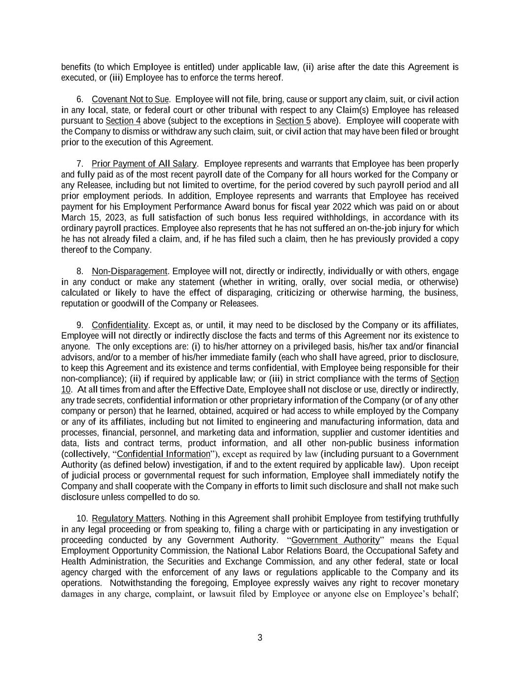 3 benefits (to which Employee is entitled) under applicable law, (ii) arise after the date this Agreement is executed, or (iii) Employee has to enforce the terms hereof. 6. Covenant Not to Sue. Employee will not file, bring, cause or support any claim, suit, or civil action in any local, state, or federal court or other tribunal with respect to any Claim(s) Employee has released pursuant to Section 4 above (subject to the exceptions in Section 5 above). Employee will cooperate with the Company to dismiss or withdraw any such claim, suit, or civil action that may have been filed or brought prior to the execution of this Agreement. 7. Prior Payment of All Salary. Employee represents and warrants that Employee has been properly and fully paid as of the most recent payroll date of the Company for all hours worked for the Company or any Releasee, including but not limited to overtime, for the period covered by such payroll period and all prior employment periods. In addition, Employee represents and warrants that Employee has received payment for his Employment Performance Award bonus for fiscal year 2022 which was paid on or about March 15, 2023, as full satisfaction of such bonus less required withholdings, in accordance with its ordinary payroll practices. Employee also represents that he has not suffered an on-the-job injury for which he has not already filed a claim, and, if he has filed such a claim, then he has previously provided a copy thereof to the Company. 8. Non-Disparagement. Employee will not, directly or indirectly, individually or with others, engage in any conduct or make any statement (whether in writing, orally, over social media, or otherwise) calculated or likely to have the effect of disparaging, criticizing or otherwise harming, the business, reputation or goodwill of the Company or Releasees. 9. Confidentiality. Except as, or until, it may need to be disclosed by the Company or its affiliates, Employee will not directly or indirectly disclose the facts and terms of this Agreement nor its existence to anyone. The only exceptions are: (i) to his/her attorney on a privileged basis, his/her tax and/or financial advisors, and/or to a member of his/her immediate family (each who shall have agreed, prior to disclosure, to keep this Agreement and its existence and terms confidential, with Employee being responsible for their non-compliance); (ii) if required by applicable law; or (iii) in strict compliance with the terms of Section 10. At all times from and after the Effective Date, Employee shall not disclose or use, directly or indirectly, any trade secrets, confidential information or other proprietary information of the Company (or of any other company or person) that he learned, obtained, acquired or had access to while employed by the Company or any of its affiliates, including but not limited to engineering and manufacturing information, data and processes, financial, personnel, and marketing data and information, supplier and customer identities and data, lists and contract terms, product information, and all other non-public business information (collectively, “Confidential Information”), except as required by law (including pursuant to a Government Authority (as defined below) investigation, if and to the extent required by applicable law). Upon receipt of judicial process or governmental request for such information, Employee shall immediately notify the Company and shall cooperate with the Company in efforts to limit such disclosure and shall not make such disclosure unless compelled to do so. 10. Regulatory Matters. Nothing in this Agreement shall prohibit Employee from testifying truthfully in any legal proceeding or from speaking to, filing a charge with or participating in any investigation or proceeding conducted by any Government Authority. “Government Authority” means the Equal Employment Opportunity Commission, the National Labor Relations Board, the Occupational Safety and Health Administration, the Securities and Exchange Commission, and any other federal, state or local agency charged with the enforcement of any laws or regulations applicable to the Company and its operations. Notwithstanding the foregoing, Employee expressly waives any right to recover monetary damages in any charge, complaint, or lawsuit filed by Employee or anyone else on Employee’s behalf;