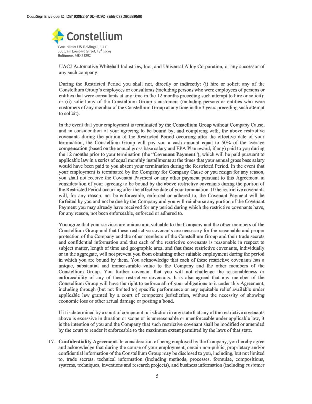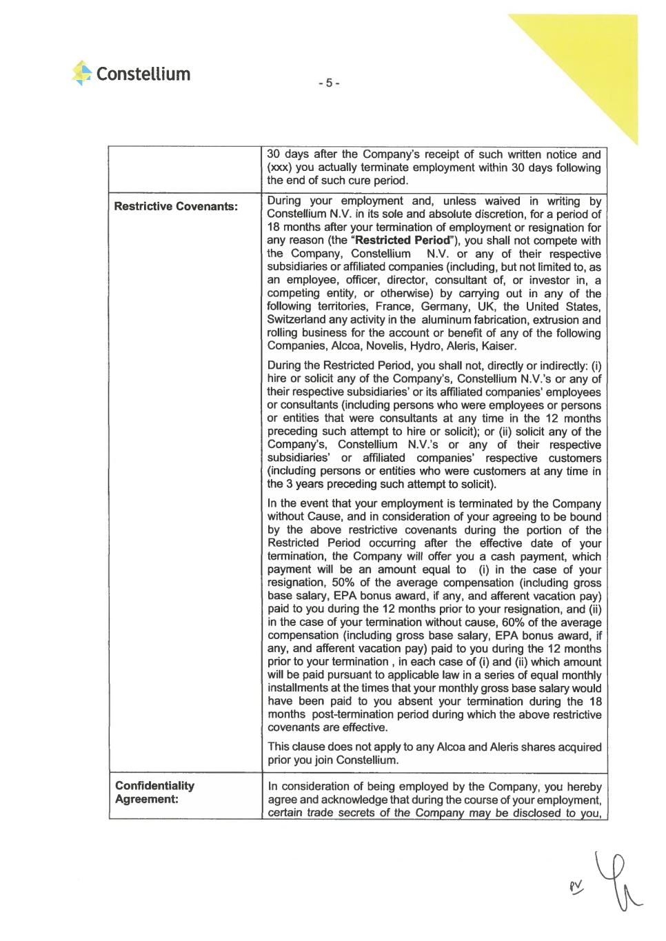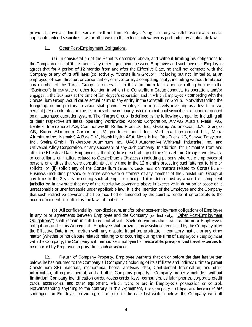 4 provided, however, that this waiver shall not limit Employee’s rights to any whistleblower award under applicable federal securities laws or otherwise to the extent such waiver is prohibited by applicable law. 11. Other Post-Employment Obligations. (a) In consideration of the Benefits described above, and without limiting his obligations to the Company or its affiliates under any other agreements between Employee and such persons, Employee agrees that for a period of 12 months from and after the Effective Date, he shall not compete with the Company or any of its affiliates (collectively, “Constellium Group”), including but not limited to, as an employee, officer, director, or consultant of, or investor in, a competing entity, including without limitation any member of the Target Group, or otherwise, in the aluminium fabrication or rolling business (the “Business”) in any state or other location in which the Constellium Group conducts its operations and/or engages in the Business at the time of Employee’s separation and in which Employee’s competing with the Constellium Group would cause actual harm to any entity in the Constellium Group. Notwithstanding the foregoing, nothing in this provision shall prevent Employee from passively investing as a less than two percent (2%) stockholder in the securities of any company listed on a national securities exchange or quoted on an automated quotation system. The “Target Group” is defined as the following companies including all of their respective affiliates, operating worldwide: Arconic Corporation, AMAG Austria Metall AG, Benteler International AG, Commonwealth Rolled Products, Inc., Gestamp Automocion, S.A., Gränges AB, Kaiser Aluminum Corporation, Magna International Inc., Martinrea International Inc., Metra Aluminum Inc., Nemak S.A.B de C.V., Norsk Hydro ASA, Novelis Inc, Otto Fuchs KG, Sankyo Tateyama, Inc., Speira GmbH, Tri-Arrows Aluminum Inc., UACJ Automotive Whitehall Industries, Inc., and Universal Alloy Corporation, or any successor of any such company. In addition, for 12 months from and after the Effective Date, Employee shall not (i) hire or solicit any of the Constellium Group’s employees, or consultants on matters related to Constellium’s Business (including persons who were employees of persons or entities that were consultants at any time in the 12 months preceding such attempt to hire or solicit); or (ii) solicit any of the Constellium Group’s customers on matters related to Constellium’s Business (including persons or entities who were customers of any member of the Constellium Group at any time in the 3 years preceding such attempt to solicit). If it is determined by a court of competent jurisdiction in any state that any of the restrictive covenants above is excessive in duration or scope or is unreasonable or unenforceable under applicable law, it is the intention of the Employee and the Company that such restrictive covenant shall be modified or amended by the court to render it enforceable to the maximum extent permitted by the laws of that state. (b) All confidentiality, non-disclosure, and/or other post-employment obligations of Employee in any prior agreements between Employee and the Company (collectively, “Other Post-Employment Obligations”) shall remain in full force and effect. Such obligations shall be in addition to Employee’s obligations under this Agreement. Employee shall provide any assistance requested by the Company after the Effective Date in connection with any dispute, litigation, arbitration, regulatory matter, or any other matter (whether or not dispute related) relating to or occurring during the time of Employee’s employment with the Company; the Company will reimburse Employee for reasonable, pre-approved travel expenses to be incurred by Employee in providing such assistance. 12. Return of Company Property. Employee warrants that on or before the date last written below, he has returned to the Company all Company (including of its affiliates and indirect ultimate parent Constellium SE) materials, memoranda, books, analyses, data, Confidential Information, and other information, all copies thereof, and all other Company property. Company property includes, without limitation, Company identification cards, access cards, keys, computers, cellular phones, corporate credit cards, accessories, and other equipment, which were or are in Employee’s possession or control. Notwithstanding anything to the contrary in this Agreement, the Company’s obligations hereunder are contingent on Employee providing, on or prior to the date last written below, the Company with all