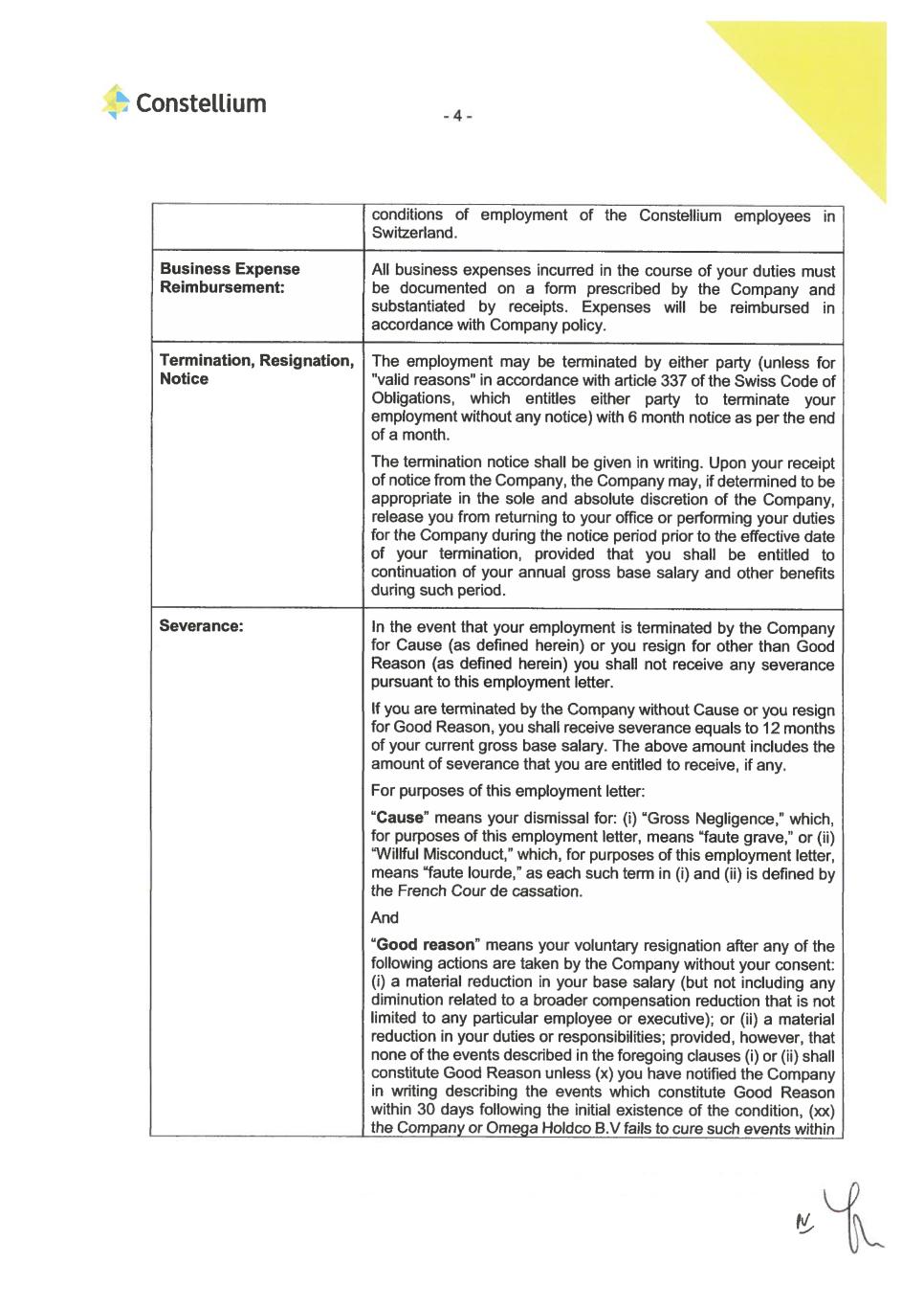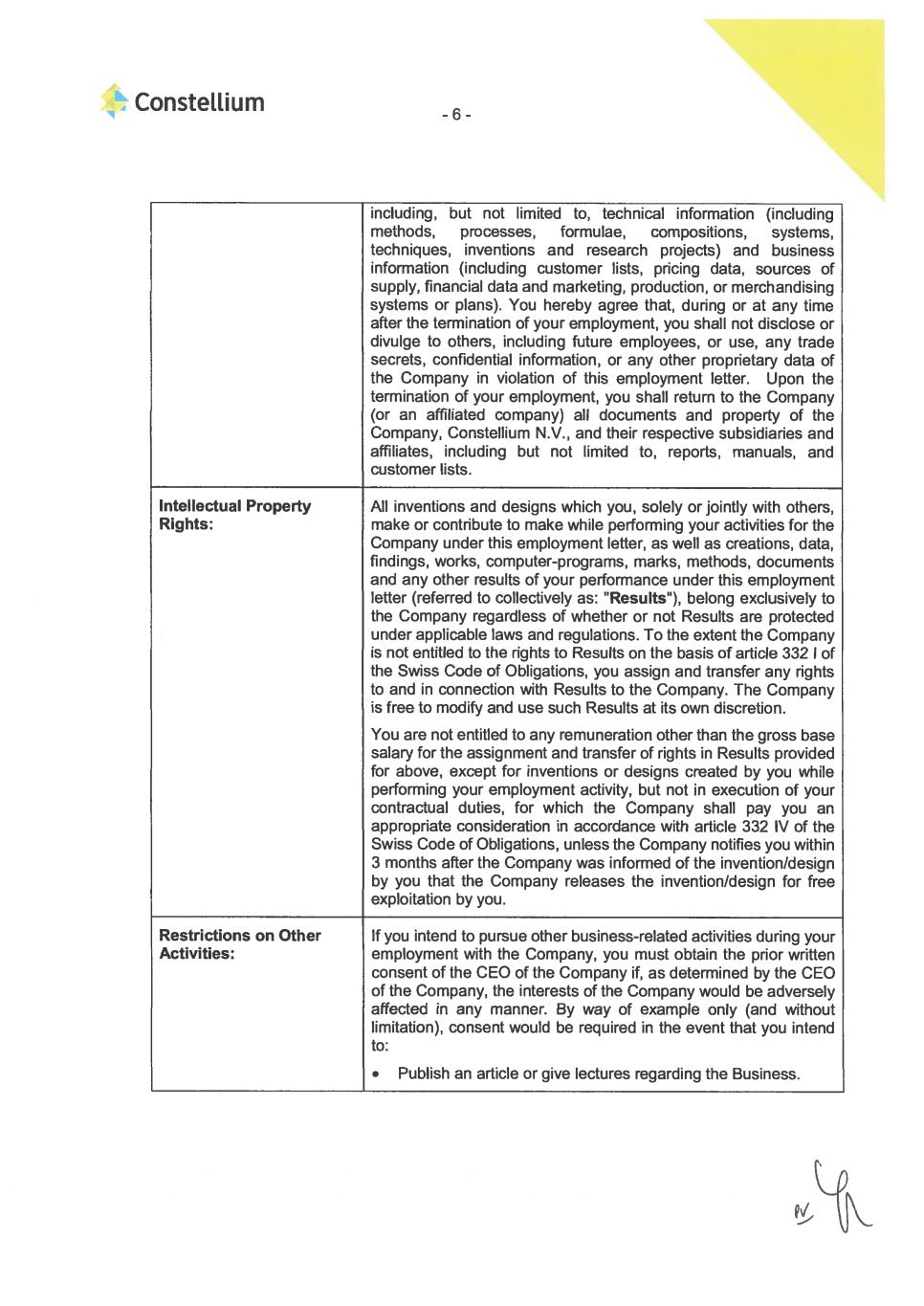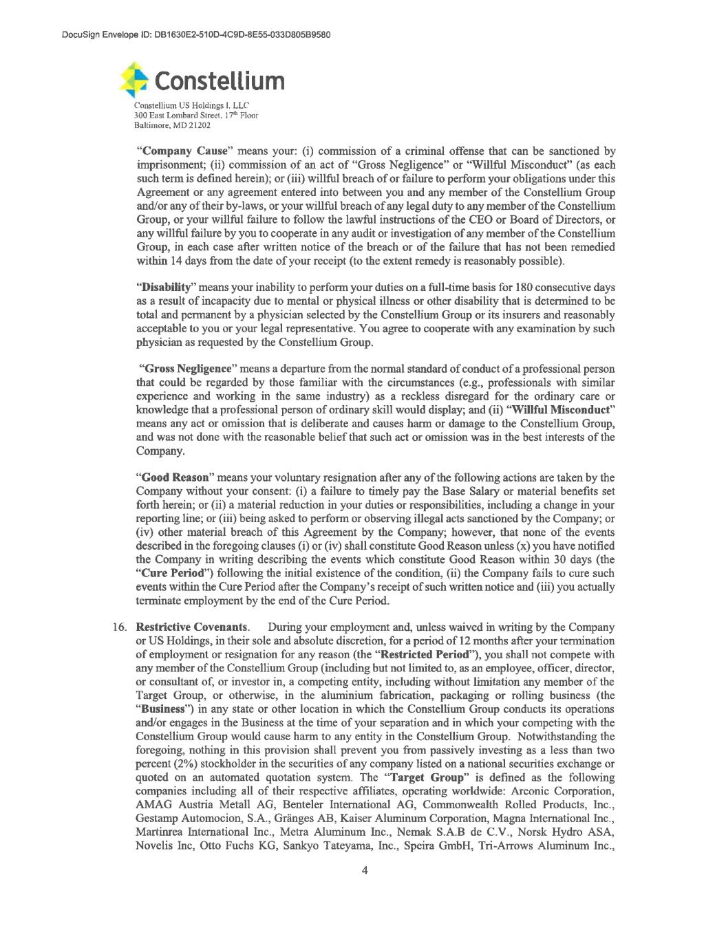 4 provided, however, that this waiver shall not limit Employee’s rights to any whistleblower award under applicable federal securities laws or otherwise to the extent such waiver is prohibited by applicable law. 11. Other Post-Employment Obligations. (a) In consideration of the Benefits described above, and without limiting his obligations to the Company or its affiliates under any other agreements between Employee and such persons, Employee agrees that for a period of 12 months from and after the Effective Date, he shall not compete with the Company or any of its affiliates (collectively, “Constellium Group”), including but not limited to, as an employee, officer, director, or consultant of, or investor in, a competing entity, including without limitation any member of the Target Group, or otherwise, in the aluminium fabrication or rolling business (the “Business”) in any state or other location in which the Constellium Group conducts its operations and/or engages in the Business at the time of Employee’s separation and in which Employee’s competing with the Constellium Group would cause actual harm to any entity in the Constellium Group. Notwithstanding the foregoing, nothing in this provision shall prevent Employee from passively investing as a less than two percent (2%) stockholder in the securities of any company listed on a national securities exchange or quoted on an automated quotation system. The “Target Group” is defined as the following companies including all of their respective affiliates, operating worldwide: Arconic Corporation, AMAG Austria Metall AG, Benteler International AG, Commonwealth Rolled Products, Inc., Gestamp Automocion, S.A., Gränges AB, Kaiser Aluminum Corporation, Magna International Inc., Martinrea International Inc., Metra Aluminum Inc., Nemak S.A.B de C.V., Norsk Hydro ASA, Novelis Inc, Otto Fuchs KG, Sankyo Tateyama, Inc., Speira GmbH, Tri-Arrows Aluminum Inc., UACJ Automotive Whitehall Industries, Inc., and Universal Alloy Corporation, or any successor of any such company. In addition, for 12 months from and after the Effective Date, Employee shall not (i) hire or solicit any of the Constellium Group’s employees, or consultants on matters related to Constellium’s Business (including persons who were employees of persons or entities that were consultants at any time in the 12 months preceding such attempt to hire or solicit); or (ii) solicit any of the Constellium Group’s customers on matters related to Constellium’s Business (including persons or entities who were customers of any member of the Constellium Group at any time in the 3 years preceding such attempt to solicit). If it is determined by a court of competent jurisdiction in any state that any of the restrictive covenants above is excessive in duration or scope or is unreasonable or unenforceable under applicable law, it is the intention of the Employee and the Company that such restrictive covenant shall be modified or amended by the court to render it enforceable to the maximum extent permitted by the laws of that state. (b) All confidentiality, non-disclosure, and/or other post-employment obligations of Employee in any prior agreements between Employee and the Company (collectively, “Other Post-Employment Obligations”) shall remain in full force and effect. Such obligations shall be in addition to Employee’s obligations under this Agreement. Employee shall provide any assistance requested by the Company after the Effective Date in connection with any dispute, litigation, arbitration, regulatory matter, or any other matter (whether or not dispute related) relating to or occurring during the time of Employee’s employment with the Company; the Company will reimburse Employee for reasonable, pre-approved travel expenses to be incurred by Employee in providing such assistance. 12. Return of Company Property. Employee warrants that on or before the date last written below, he has returned to the Company all Company (including of its affiliates and indirect ultimate parent Constellium SE) materials, memoranda, books, analyses, data, Confidential Information, and other information, all copies thereof, and all other Company property. Company property includes, without limitation, Company identification cards, access cards, keys, computers, cellular phones, corporate credit cards, accessories, and other equipment, which were or are in Employee’s possession or control. Notwithstanding anything to the contrary in this Agreement, the Company’s obligations hereunder are contingent on Employee providing, on or prior to the date last written below, the Company with all