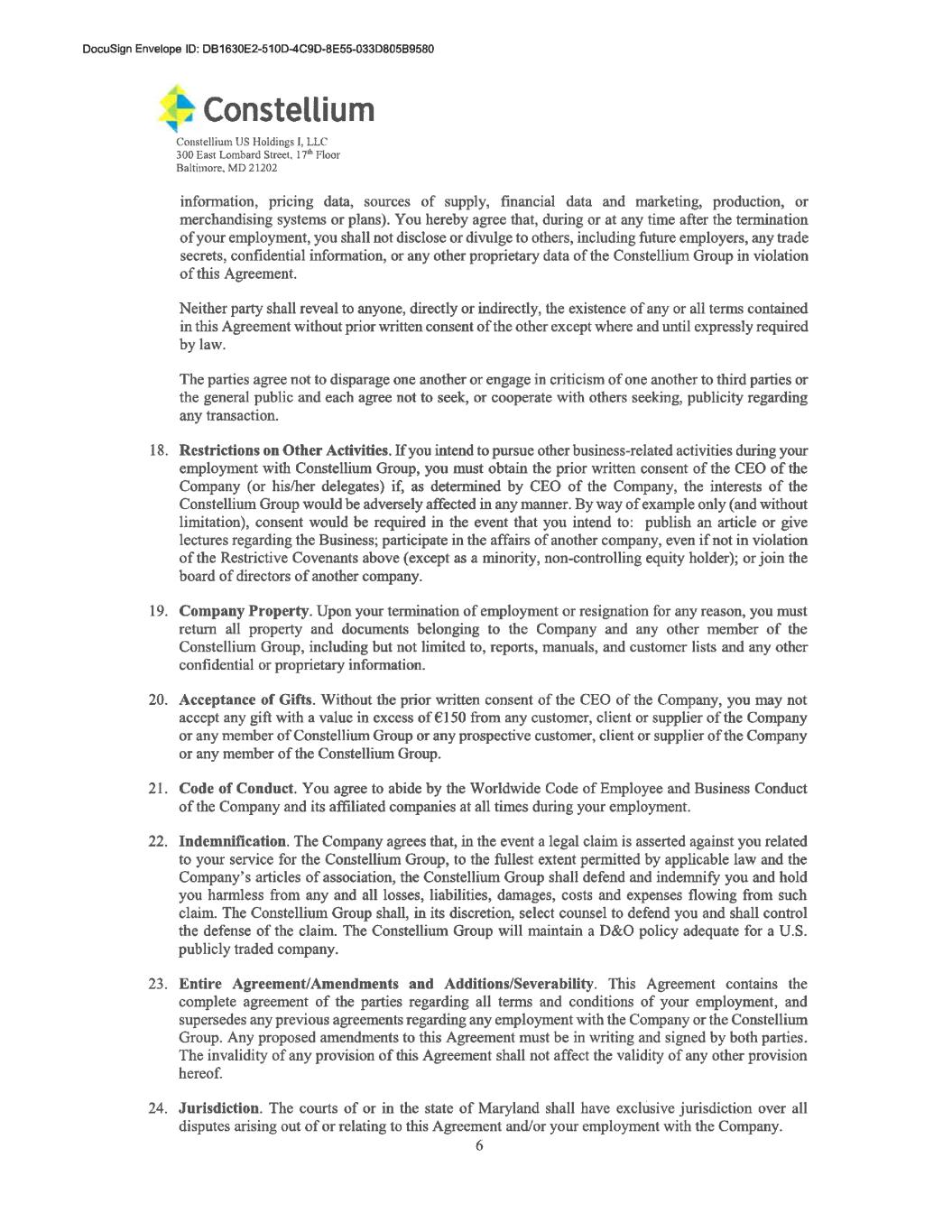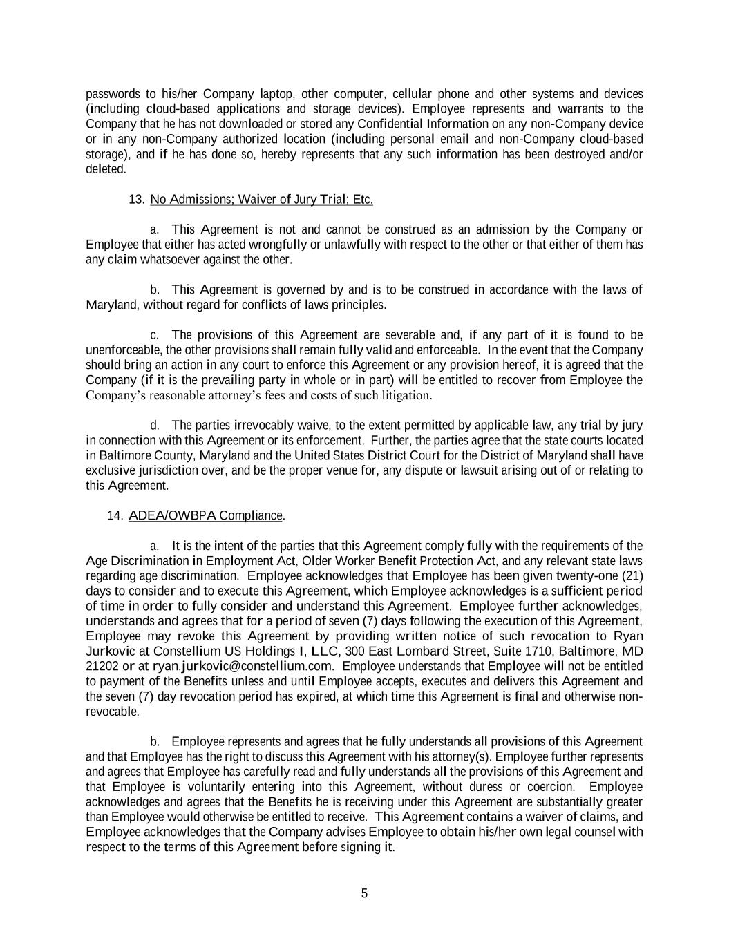 5 passwords to his/her Company laptop, other computer, cellular phone and other systems and devices (including cloud-based applications and storage devices). Employee represents and warrants to the Company that he has not downloaded or stored any Confidential Information on any non-Company device or in any non-Company authorized location (including personal email and non-Company cloud-based storage), and if he has done so, hereby represents that any such information has been destroyed and/or deleted. 13. No Admissions; Waiver of Jury Trial; Etc. a. This Agreement is not and cannot be construed as an admission by the Company or Employee that either has acted wrongfully or unlawfully with respect to the other or that either of them has any claim whatsoever against the other. b. This Agreement is governed by and is to be construed in accordance with the laws of Maryland, without regard for conflicts of laws principles. c. The provisions of this Agreement are severable and, if any part of it is found to be unenforceable, the other provisions shall remain fully valid and enforceable. In the event that the Company should bring an action in any court to enforce this Agreement or any provision hereof, it is agreed that the Company (if it is the prevailing party in whole or in part) will be entitled to recover from Employee the Company’s reasonable attorney’s fees and costs of such litigation. d. The parties irrevocably waive, to the extent permitted by applicable law, any trial by jury in connection with this Agreement or its enforcement. Further, the parties agree that the state courts located in Baltimore County, Maryland and the United States District Court for the District of Maryland shall have exclusive jurisdiction over, and be the proper venue for, any dispute or lawsuit arising out of or relating to this Agreement. 14. ADEA/OWBPA Compliance. a. It is the intent of the parties that this Agreement comply fully with the requirements of the Age Discrimination in Employment Act, Older Worker Benefit Protection Act, and any relevant state laws regarding age discrimination. Employee acknowledges that Employee has been given twenty-one (21) days to consider and to execute this Agreement, which Employee acknowledges is a sufficient period of time in order to fully consider and understand this Agreement. Employee further acknowledges, understands and agrees that for a period of seven (7) days following the execution of this Agreement, Employee may revoke this Agreement by providing written notice of such revocation to Ryan Jurkovic at Constellium US Holdings I, LLC, 300 East Lombard Street, Suite 1710, Baltimore, MD 21202 or at ryan.jurkovic@constellium.com. Employee understands that Employee will not be entitled to payment of the Benefits unless and until Employee accepts, executes and delivers this Agreement and the seven (7) day revocation period has expired, at which time this Agreement is final and otherwise non- revocable. b. Employee represents and agrees that he fully understands all provisions of this Agreement and that Employee has the right to discuss this Agreement with his attorney(s). Employee further represents and agrees that Employee has carefully read and fully understands all the provisions of this Agreement and that Employee is voluntarily entering into this Agreement, without duress or coercion. Employee acknowledges and agrees that the Benefits he is receiving under this Agreement are substantially greater than Employee would otherwise be entitled to receive. This Agreement contains a waiver of claims, and Employee acknowledges that the Company advises Employee to obtain his/her own legal counsel with respect to the terms of this Agreement before signing it.