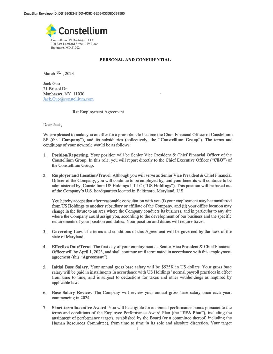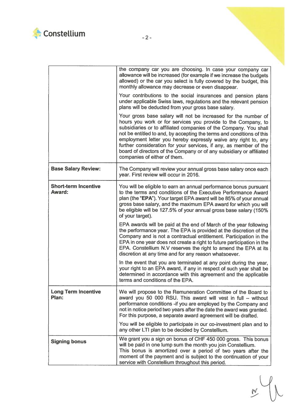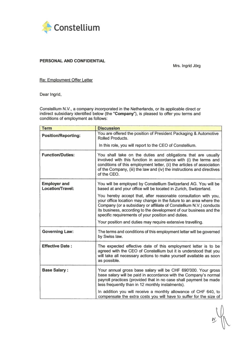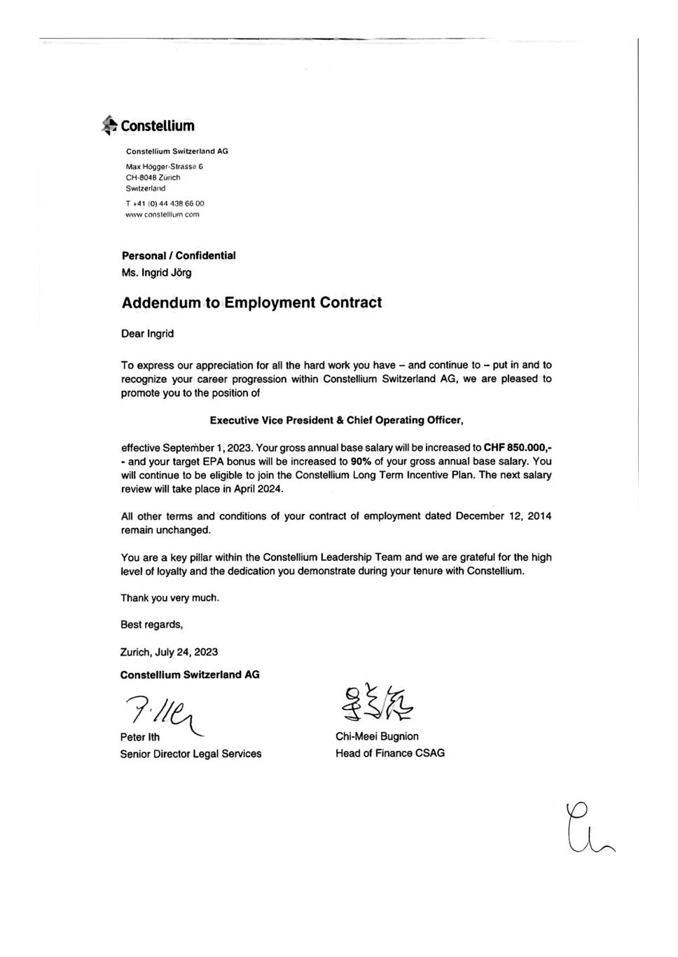 Constellium Constellium Switzerland AG Max Högger-Strasso 6 CH-8048 Zürich Swtzerland T441 (0) 44 438 66 00 ww constellumcom Personal/Confidential Ms. Ingrid Jörg Addendum to Employment Contract Dear Ingrid To express our appreciation for all the hard work you have - and continue to - put in and to recognize your career progression within Constellium Switzerland AG, we are pleased to promote you to the position of Executive Vice President & Chief Operating Officer, effective Septermber 1, 2023. Your gross annual base salary will be increased to CHF 850.000,- - and your target EPA bonus will be increased to 90% of your gross annual base salary. You will continue to be eligible to join the Constellium Long Term Incentive Plan. The next salary review will take place in April 2024. All other terms and conditions of your contract of employment dated December 12, 2014 remain unchanged. You are a key pillar within the Constellium Leadership Team and we are grateful for the high level of loyalty and the dedication you demonstrate during your tenure with Constellium. Thank you very much. Best regards, Zurich, July 24, 2023 Constelium Switzerland AG 2Peter Ith Senior Director Legal Services Chi-Meei Bugnion Head of Finance CSAG
