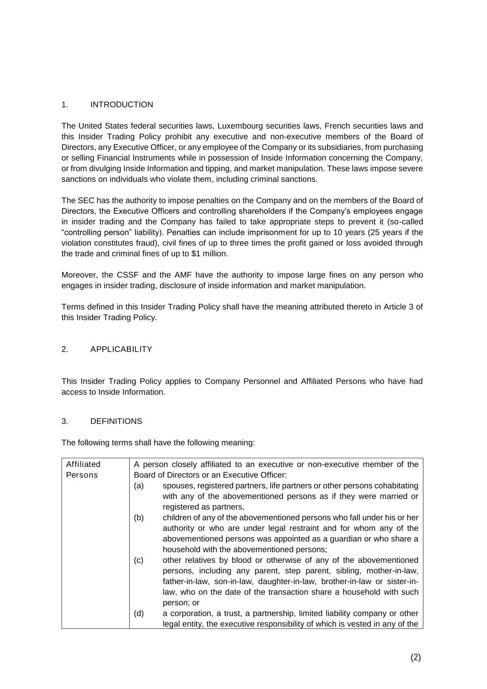 (2) 1. INTRODUCTION The United States federal securities laws, Luxembourg securities laws, French securities laws and this Insider Trading Policy prohibit any executive and non-executive members of the Board of Directors, any Executive Officer, or any employee of the Company or its subsidiaries, from purchasing or selling Financial Instruments while in possession of Inside Information concerning the Company, or from divulging Inside Information and tipping, and market manipulation. These laws impose severe sanctions on individuals who violate them, including criminal sanctions. The SEC has the authority to impose penalties on the Company and on the members of the Board of Directors, the Executive Officers and controlling shareholders if the Company’s employees engage in insider trading and the Company has failed to take appropriate steps to prevent it (so-called “controlling person” liability). Penalties can include imprisonment for up to 10 years (25 years if the violation constitutes fraud), civil fines of up to three times the profit gained or loss avoided through the trade and criminal fines of up to $1 million. Moreover, the CSSF and the AMF have the authority to impose large fines on any person who engages in insider trading, disclosure of inside information and market manipulation. Terms defined in this Insider Trading Policy shall have the meaning attributed thereto in Article 3 of this Insider Trading Policy. 2. APPLICABILITY This Insider Trading Policy applies to Company Personnel and Affiliated Persons who have had access to Inside Information. 3. DEFINITIONS The following terms shall have the following meaning: Affiliated Persons A person closely affiliated to an executive or non-executive member of the Board of Directors or an Executive Officer: (a) spouses, registered partners, life partners or other persons cohabitating with any of the abovementioned persons as if they were married or registered as partners, (b) children of any of the abovementioned persons who fall under his or her authority or who are under legal restraint and for whom any of the abovementioned persons was appointed as a guardian or who share a household with the abovementioned persons; (c) other relatives by blood or otherwise of any of the abovementioned persons, including any parent, step parent, sibling, mother-in-law, father-in-law, son-in-law, daughter-in-law, brother-in-law or sister-in- law, who on the date of the transaction share a household with such person; or (d) a corporation, a trust, a partnership, limited liability company or other legal entity, the executive responsibility of which is vested in any of the