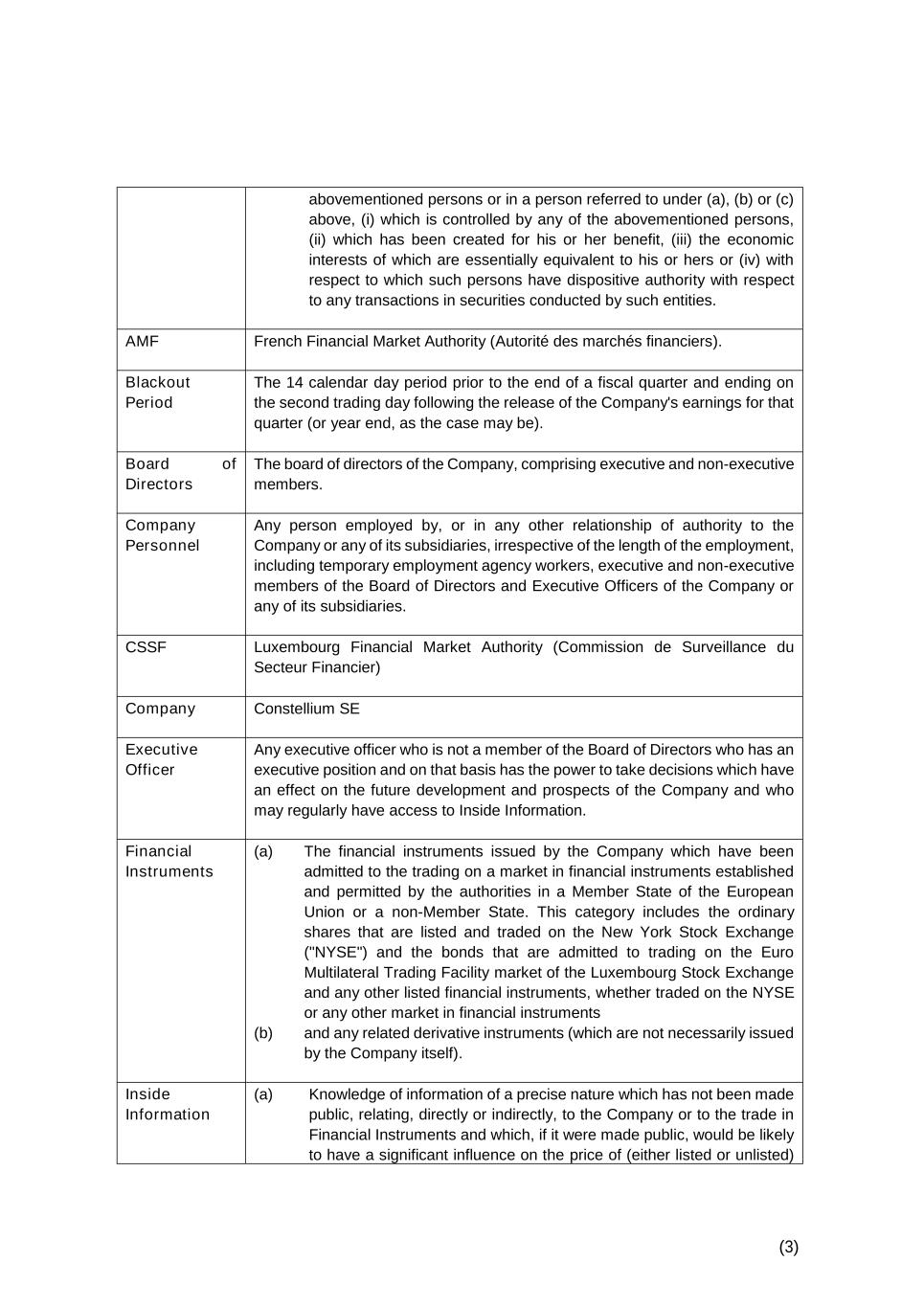 (3) abovementioned persons or in a person referred to under (a), (b) or (c) above, (i) which is controlled by any of the abovementioned persons, (ii) which has been created for his or her benefit, (iii) the economic interests of which are essentially equivalent to his or hers or (iv) with respect to which such persons have dispositive authority with respect to any transactions in securities conducted by such entities. AMF French Financial Market Authority (Autorité des marchés financiers). Blackout Period The 14 calendar day period prior to the end of a fiscal quarter and ending on the second trading day following the release of the Company's earnings for that quarter (or year end, as the case may be). Board of Directors The board of directors of the Company, comprising executive and non-executive members. Company Personnel Any person employed by, or in any other relationship of authority to the Company or any of its subsidiaries, irrespective of the length of the employment, including temporary employment agency workers, executive and non-executive members of the Board of Directors and Executive Officers of the Company or any of its subsidiaries. CSSF Luxembourg Financial Market Authority (Commission de Surveillance du Secteur Financier) Company Constellium SE Executive Officer Any executive officer who is not a member of the Board of Directors who has an executive position and on that basis has the power to take decisions which have an effect on the future development and prospects of the Company and who may regularly have access to Inside Information. Financial Instruments (a) The financial instruments issued by the Company which have been admitted to the trading on a market in financial instruments established and permitted by the authorities in a Member State of the European Union or a non-Member State. This category includes the ordinary shares that are listed and traded on the New York Stock Exchange ("NYSE") and the bonds that are admitted to trading on the Euro Multilateral Trading Facility market of the Luxembourg Stock Exchange and any other listed financial instruments, whether traded on the NYSE or any other market in financial instruments (b) and any related derivative instruments (which are not necessarily issued by the Company itself). Inside Information (a) Knowledge of information of a precise nature which has not been made public, relating, directly or indirectly, to the Company or to the trade in Financial Instruments and which, if it were made public, would be likely to have a significant influence on the price of (either listed or unlisted)