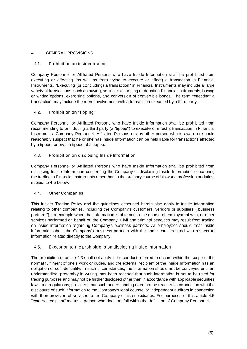 (5) 4. GENERAL PROVISIONS 4.1. Prohibition on insider trading Company Personnel or Affiliated Persons who have Inside Information shall be prohibited from executing or effecting (as well as from trying to execute or effect) a transaction in Financial Instruments. "Executing (or concluding) a transaction" in Financial Instruments may include a large variety of transactions, such as buying, selling, exchanging or donating Financial Instruments, buying or writing options, exercising options, and conversion of convertible bonds. The term "effecting" a transaction may include the mere involvement with a transaction executed by a third party. 4.2. Prohibition on "tipping" Company Personnel or Affiliated Persons who have Inside Information shall be prohibited from recommending to or inducing a third party (a "tippee") to execute or effect a transaction in Financial Instruments. Company Personnel, Affiliated Persons or any other person who is aware or should reasonably suspect that he or she has Inside Information can be held liable for transactions affected by a tippee, or even a tippee of a tippee. 4.3. Prohibition on disclosing Inside Information Company Personnel or Affiliated Persons who have Inside Information shall be prohibited from disclosing Inside Information concerning the Company or disclosing Inside Information concerning the trading in Financial Instruments other than in the ordinary course of his work, profession or duties, subject to 4.5 below. 4.4. Other Companies This Insider Trading Policy and the guidelines described herein also apply to inside information relating to other companies, including the Company's customers, vendors or suppliers ("business partners"), for example when that information is obtained in the course of employment with, or other services performed on behalf of, the Company. Civil and criminal penalties may result from trading on inside information regarding Company's business partners. All employees should treat inside information about the Company's business partners with the same care required with respect to information related directly to the Company. 4.5. Exception to the prohibitions on disclosing Inside Information The prohibition of article 4.3 shall not apply if the conduct referred to occurs within the scope of the normal fulfilment of one’s work or duties, and the external recipient of the Inside Information has an obligation of confidentiality. In such circumstances, the information should not be conveyed until an understanding, preferably in writing, has been reached that such information is not to be used for trading purposes and may not be further disclosed other than in accordance with applicable securities laws and regulations; provided, that such understanding need not be reached in connection with the disclosure of such information to the Company's legal counsel or independent auditors in connection with their provision of services to the Company or its subsidiaries. For purposes of this article 4.5 "external recipient" means a person who does not fall within the definition of Company Personnel.