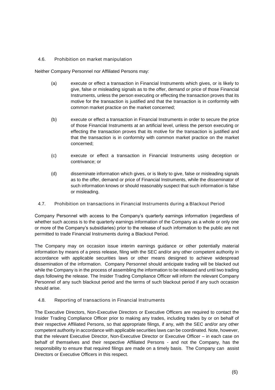 (6) 4.6. Prohibition on market manipulation Neither Company Personnel nor Affiliated Persons may: (a) execute or effect a transaction in Financial Instruments which gives, or is likely to give, false or misleading signals as to the offer, demand or price of those Financial Instruments, unless the person executing or effecting the transaction proves that its motive for the transaction is justified and that the transaction is in conformity with common market practice on the market concerned; (b) execute or effect a transaction in Financial Instruments in order to secure the price of those Financial Instruments at an artificial level, unless the person executing or effecting the transaction proves that its motive for the transaction is justified and that the transaction is in conformity with common market practice on the market concerned; (c) execute or effect a transaction in Financial Instruments using deception or contrivance; or (d) disseminate information which gives, or is likely to give, false or misleading signals as to the offer, demand or price of Financial Instruments, while the disseminator of such information knows or should reasonably suspect that such information is false or misleading. 4.7. Prohibition on transactions in Financial Instruments during a Blackout Period Company Personnel with access to the Company’s quarterly earnings information (regardless of whether such access is to the quarterly earnings information of the Company as a whole or only one or more of the Company’s subsidiaries) prior to the release of such information to the public are not permitted to trade Financial Instruments during a Blackout Period. The Company may on occasion issue interim earnings guidance or other potentially material information by means of a press release, filing with the SEC and/or any other competent authority in accordance with applicable securities laws or other means designed to achieve widespread dissemination of the information. Company Personnel should anticipate trading will be blacked out while the Company is in the process of assembling the information to be released and until two trading days following the release. The Insider Trading Compliance Officer will inform the relevant Company Personnel of any such blackout period and the terms of such blackout period if any such occasion should arise. 4.8. Reporting of transactions in Financial Instruments The Executive Directors, Non-Executive Directors or Executive Officers are required to contact the Insider Trading Compliance Officer prior to making any trades, including trades by or on behalf of their respective Affiliated Persons, so that appropriate filings, if any, with the SEC and/or any other competent authority in accordance with applicable securities laws can be coordinated. Note, however, that the relevant Executive Director, Non-Executive Director or Executive Officer – in each case on behalf of themselves and their respective Affiliated Persons - and not the Company, has the responsibility to ensure that required filings are made on a timely basis. The Company can assist Directors or Executive Officers in this respect.
