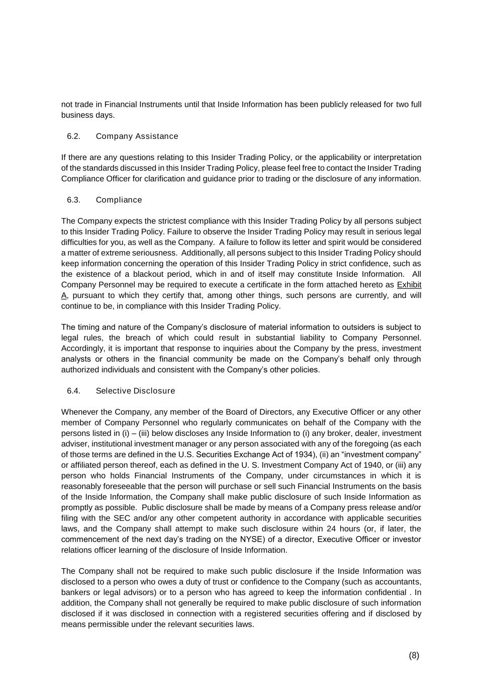 (8) not trade in Financial Instruments until that Inside Information has been publicly released for two full business days. 6.2. Company Assistance If there are any questions relating to this Insider Trading Policy, or the applicability or interpretation of the standards discussed in this Insider Trading Policy, please feel free to contact the Insider Trading Compliance Officer for clarification and guidance prior to trading or the disclosure of any information. 6.3. Compliance The Company expects the strictest compliance with this Insider Trading Policy by all persons subject to this Insider Trading Policy. Failure to observe the Insider Trading Policy may result in serious legal difficulties for you, as well as the Company. A failure to follow its letter and spirit would be considered a matter of extreme seriousness. Additionally, all persons subject to this Insider Trading Policy should keep information concerning the operation of this Insider Trading Policy in strict confidence, such as the existence of a blackout period, which in and of itself may constitute Inside Information. All Company Personnel may be required to execute a certificate in the form attached hereto as Exhibit A, pursuant to which they certify that, among other things, such persons are currently, and will continue to be, in compliance with this Insider Trading Policy. The timing and nature of the Company’s disclosure of material information to outsiders is subject to legal rules, the breach of which could result in substantial liability to Company Personnel. Accordingly, it is important that response to inquiries about the Company by the press, investment analysts or others in the financial community be made on the Company’s behalf only through authorized individuals and consistent with the Company’s other policies. 6.4. Selective Disclosure Whenever the Company, any member of the Board of Directors, any Executive Officer or any other member of Company Personnel who regularly communicates on behalf of the Company with the persons listed in (i) – (iii) below discloses any Inside Information to (i) any broker, dealer, investment adviser, institutional investment manager or any person associated with any of the foregoing (as each of those terms are defined in the U.S. Securities Exchange Act of 1934), (ii) an “investment company” or affiliated person thereof, each as defined in the U. S. Investment Company Act of 1940, or (iii) any person who holds Financial Instruments of the Company, under circumstances in which it is reasonably foreseeable that the person will purchase or sell such Financial Instruments on the basis of the Inside Information, the Company shall make public disclosure of such Inside Information as promptly as possible. Public disclosure shall be made by means of a Company press release and/or filing with the SEC and/or any other competent authority in accordance with applicable securities laws, and the Company shall attempt to make such disclosure within 24 hours (or, if later, the commencement of the next day’s trading on the NYSE) of a director, Executive Officer or investor relations officer learning of the disclosure of Inside Information. The Company shall not be required to make such public disclosure if the Inside Information was disclosed to a person who owes a duty of trust or confidence to the Company (such as accountants, bankers or legal advisors) or to a person who has agreed to keep the information confidential . In addition, the Company shall not generally be required to make public disclosure of such information disclosed if it was disclosed in connection with a registered securities offering and if disclosed by means permissible under the relevant securities laws.