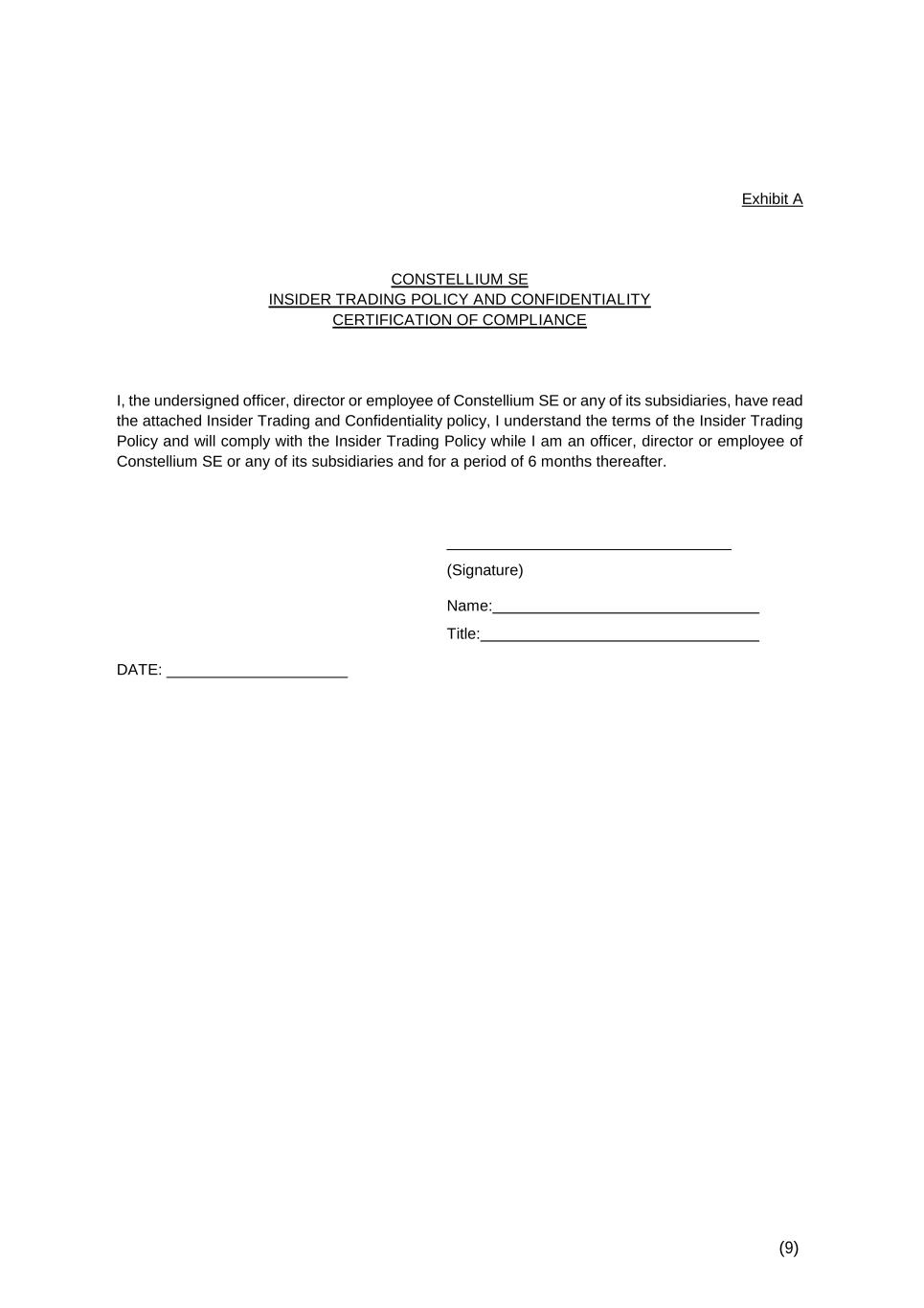 (9) Exhibit A CONSTELLIUM SE INSIDER TRADING POLICY AND CONFIDENTIALITY CERTIFICATION OF COMPLIANCE I, the undersigned officer, director or employee of Constellium SE or any of its subsidiaries, have read the attached Insider Trading and Confidentiality policy, I understand the terms of the Insider Trading Policy and will comply with the Insider Trading Policy while I am an officer, director or employee of Constellium SE or any of its subsidiaries and for a period of 6 months thereafter. _________________________________ (Signature) Name: Title: DATE: _____________________