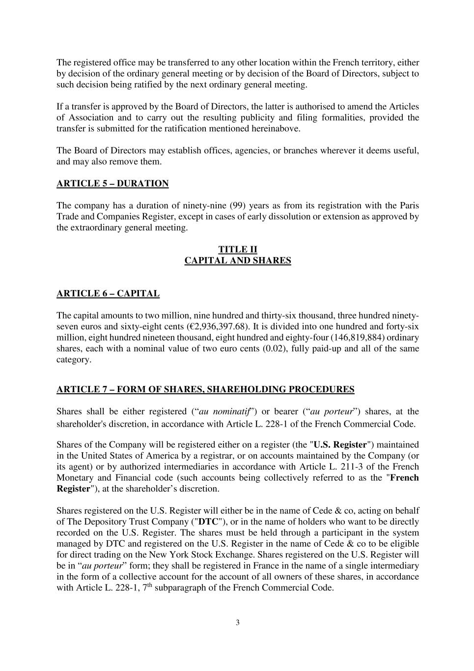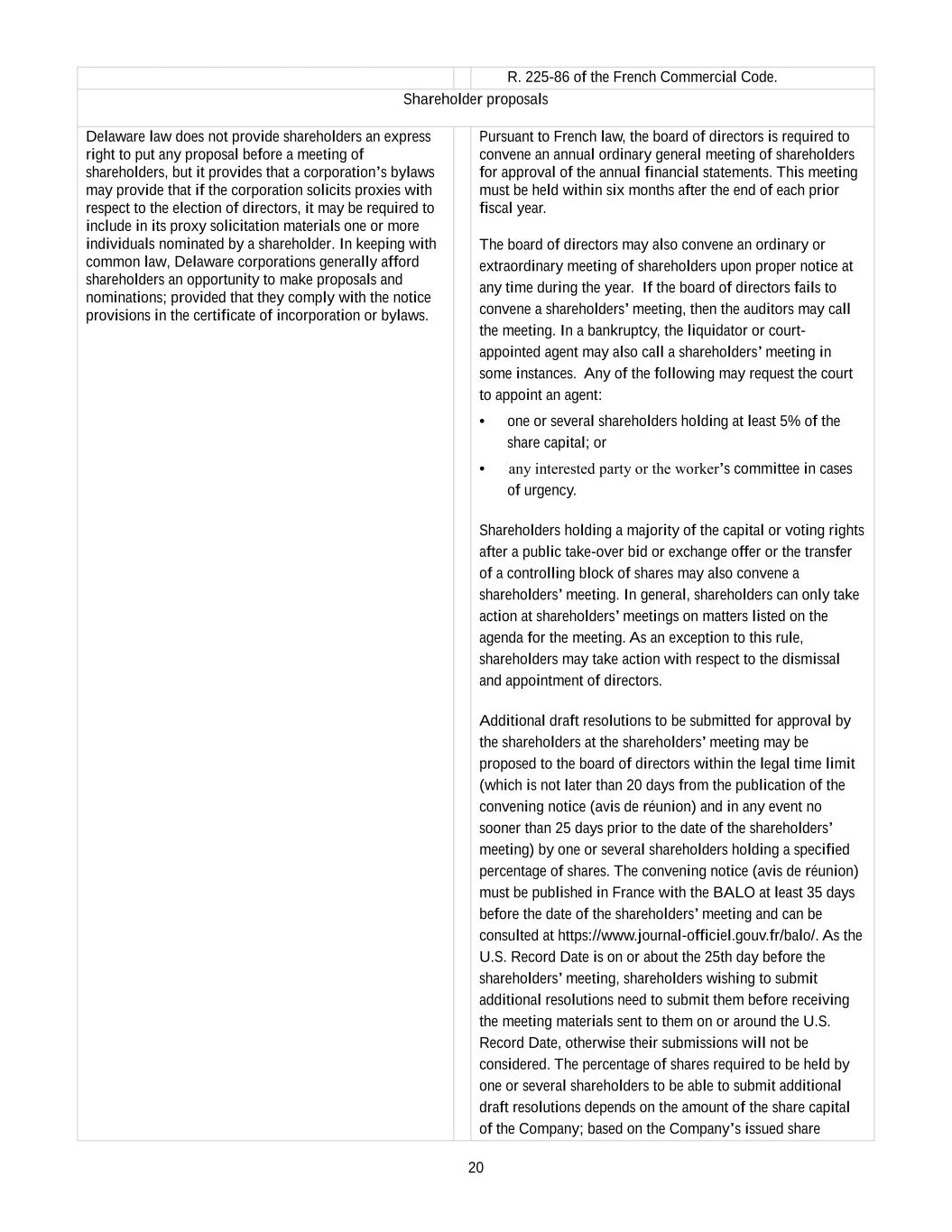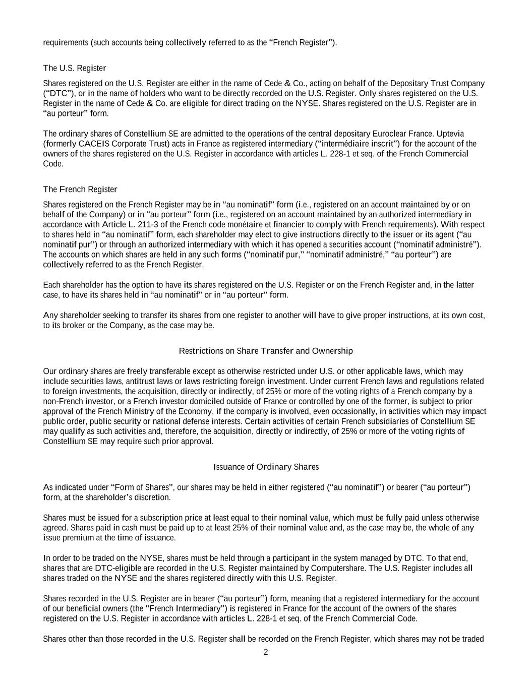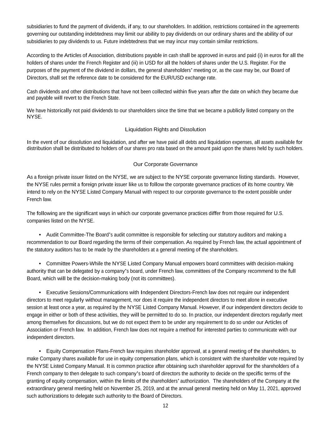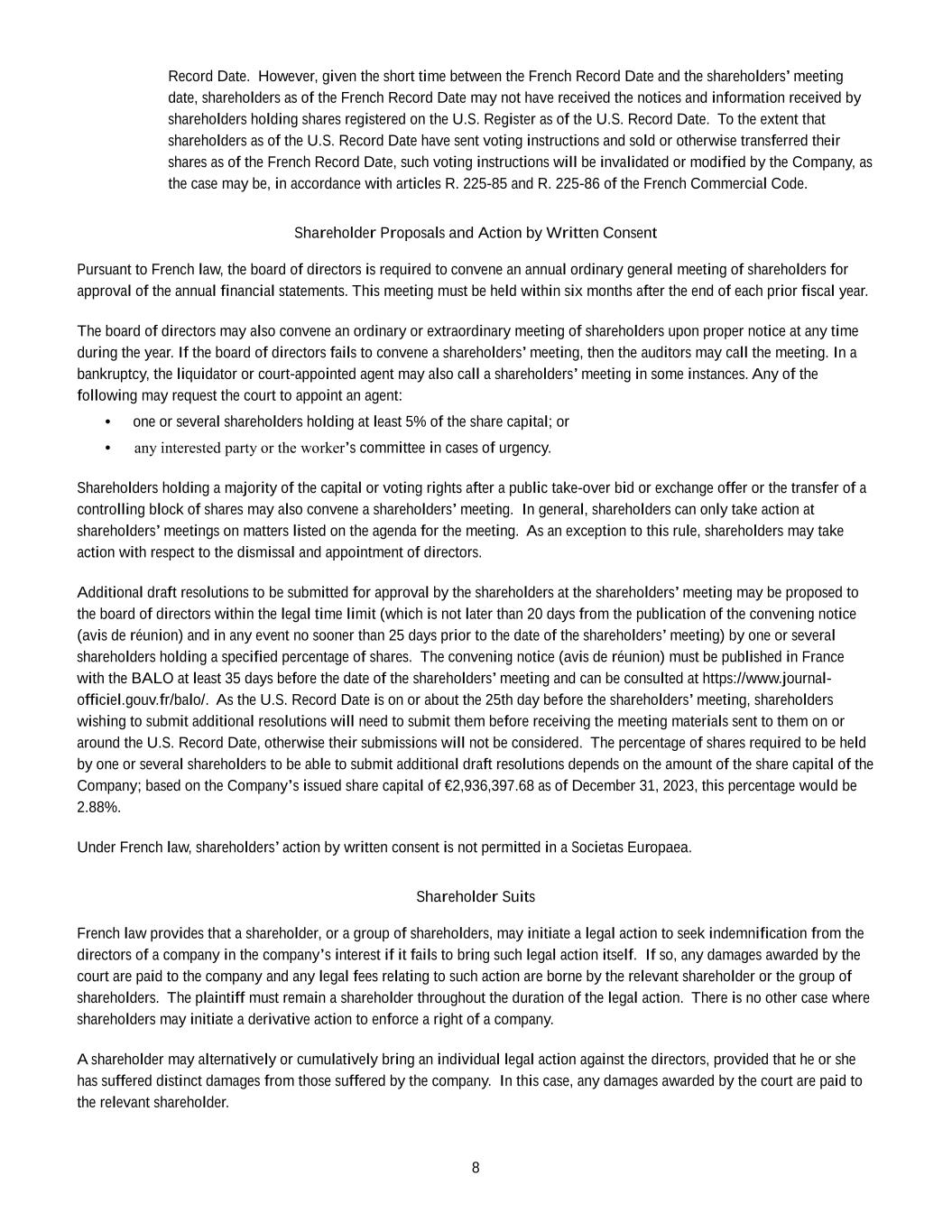 •Any inability of the Company to continue to benefit from French provisions applicable to registered intermediaries (“intermédiaires inscrits”) could adversely affect the rights of shareholders.