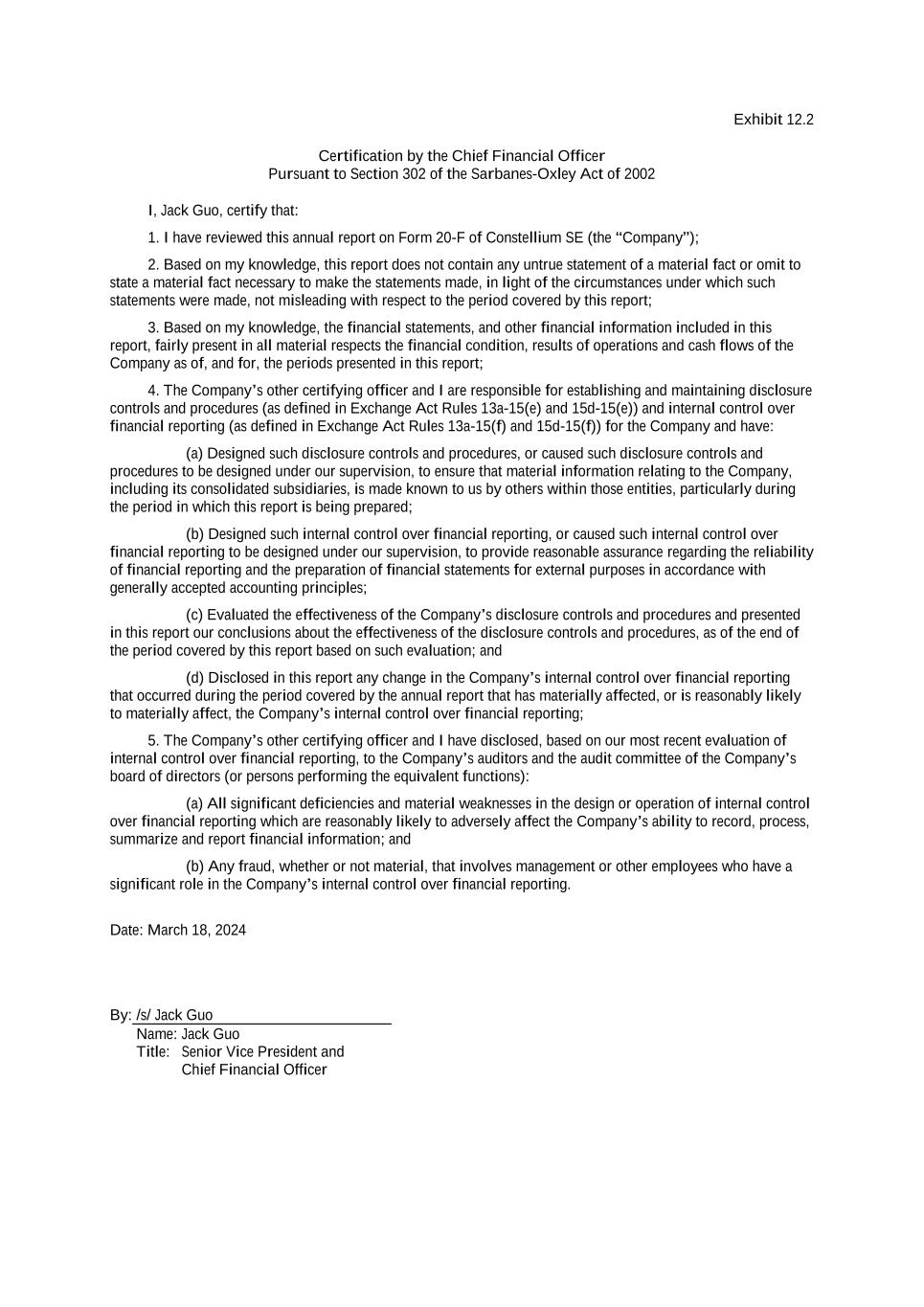 Exhibit 12.2 Certification by the Chief Financial Officer Pursuant to Section 302 of the Sarbanes-Oxley Act of 2002 I, Jack Guo, certify that: 1. I have reviewed this annual report on Form 20-F of Constellium SE (the “Company”); 2. Based on my knowledge, this report does not contain any untrue statement of a material fact or omit to state a material fact necessary to make the statements made, in light of the circumstances under which such statements were made, not misleading with respect to the period covered by this report; 3. Based on my knowledge, the financial statements, and other financial information included in this report, fairly present in all material respects the financial condition, results of operations and cash flows of the Company as of, and for, the periods presented in this report; 4. The Company’s other certifying officer and I are responsible for establishing and maintaining disclosure controls and procedures (as defined in Exchange Act Rules 13a-15(e) and 15d-15(e)) and internal control over financial reporting (as defined in Exchange Act Rules 13a-15(f) and 15d-15(f)) for the Company and have: (a) Designed such disclosure controls and procedures, or caused such disclosure controls and procedures to be designed under our supervision, to ensure that material information relating to the Company, including its consolidated subsidiaries, is made known to us by others within those entities, particularly during the period in which this report is being prepared; (b) Designed such internal control over financial reporting, or caused such internal control over financial reporting to be designed under our supervision, to provide reasonable assurance regarding the reliability of financial reporting and the preparation of financial statements for external purposes in accordance with generally accepted accounting principles; (c) Evaluated the effectiveness of the Company’s disclosure controls and procedures and presented in this report our conclusions about the effectiveness of the disclosure controls and procedures, as of the end of the period covered by this report based on such evaluation; and (d) Disclosed in this report any change in the Company’s internal control over financial reporting that occurred during the period covered by the annual report that has materially affected, or is reasonably likely to materially affect, the Company’s internal control over financial reporting; 5. The Company’s other certifying officer and I have disclosed, based on our most recent evaluation of internal control over financial reporting, to the Company’s auditors and the audit committee of the Company’s board of directors (or persons performing the equivalent functions): (a) All significant deficiencies and material weaknesses in the design or operation of internal control over financial reporting which are reasonably likely to adversely affect the Company’s ability to record, process, summarize and report financial information; and (b) Any fraud, whether or not material, that involves management or other employees who have a significant role in the Company’s internal control over financial reporting. Date: March 18, 2024 By: /s/ Jack Guo Name: Jack Guo Title: Senior Vice President and Chief Financial Officer