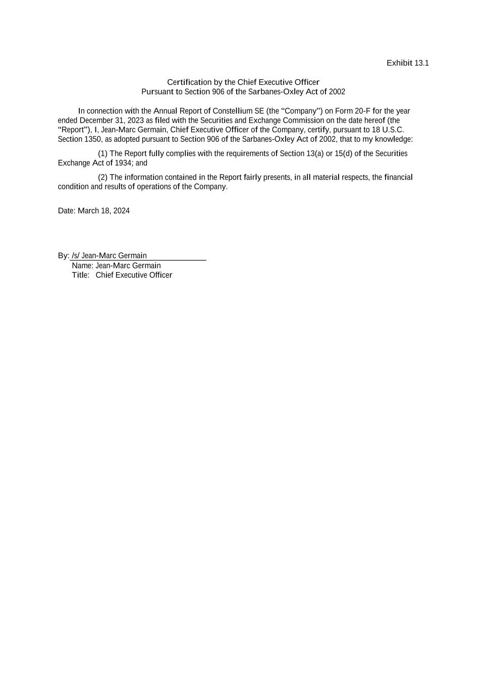 Exhibit 13.1 Certification by the Chief Executive Officer Pursuant to Section 906 of the Sarbanes-Oxley Act of 2002 In connection with the Annual Report of Constellium SE (the “Company”) on Form 20-F for the year ended December 31, 2023 as filed with the Securities and Exchange Commission on the date hereof (the “Report”), I, Jean-Marc Germain, Chief Executive Officer of the Company, certify, pursuant to 18 U.S.C. Section 1350, as adopted pursuant to Section 906 of the Sarbanes-Oxley Act of 2002, that to my knowledge: (1) The Report fully complies with the requirements of Section 13(a) or 15(d) of the Securities Exchange Act of 1934; and (2) The information contained in the Report fairly presents, in all material respects, the financial condition and results of operations of the Company. Date: March 18, 2024 By: /s/ Jean-Marc Germain Name: Jean-Marc Germain Title: Chief Executive Officer