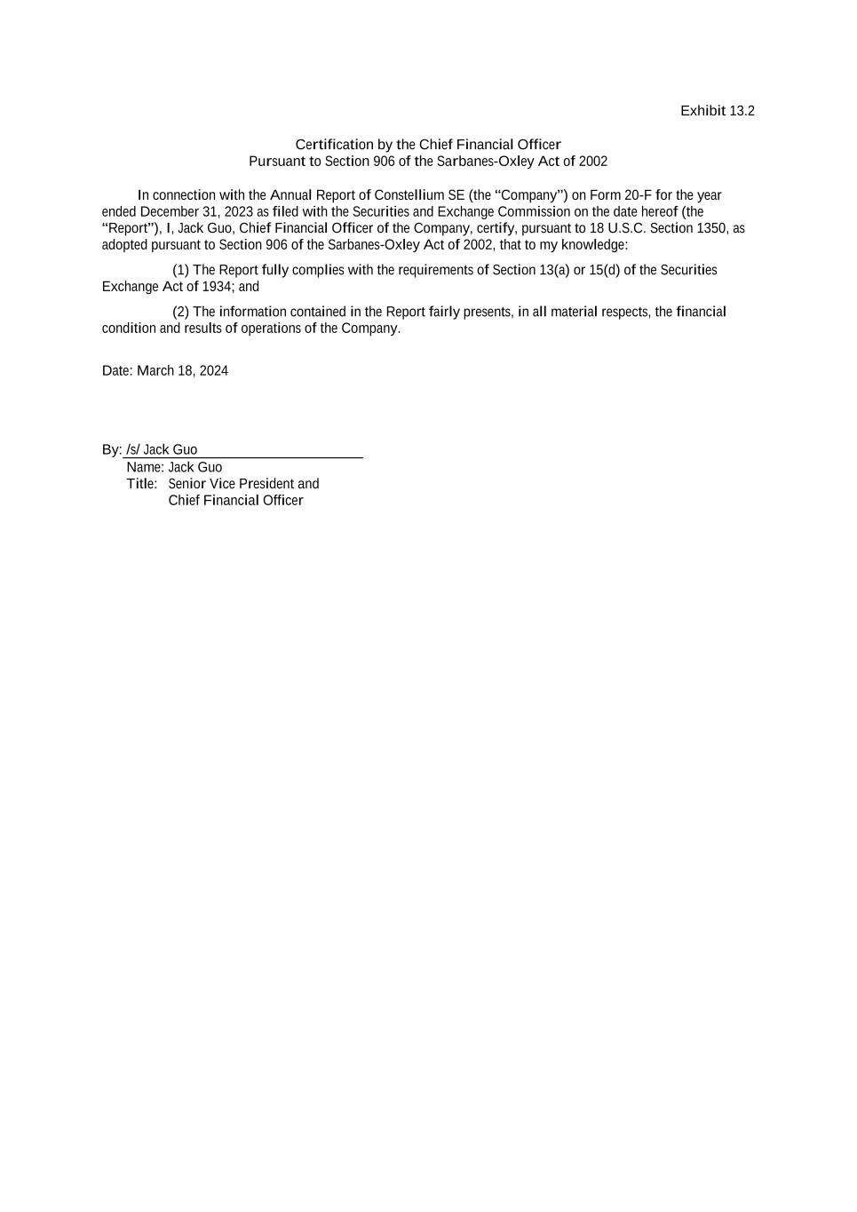 Exhibit 13.2 Certification by the Chief Financial Officer Pursuant to Section 906 of the Sarbanes-Oxley Act of 2002 In connection with the Annual Report of Constellium SE (the “Company”) on Form 20-F for the year ended December 31, 2023 as filed with the Securities and Exchange Commission on the date hereof (the “Report”), I, Jack Guo, Chief Financial Officer of the Company, certify, pursuant to 18 U.S.C. Section 1350, as adopted pursuant to Section 906 of the Sarbanes-Oxley Act of 2002, that to my knowledge: (1) The Report fully complies with the requirements of Section 13(a) or 15(d) of the Securities Exchange Act of 1934; and (2) The information contained in the Report fairly presents, in all material respects, the financial condition and results of operations of the Company. Date: March 18, 2024 By: /s/ Jack Guo Name: Jack Guo Title: Senior Vice President and Chief Financial Officer