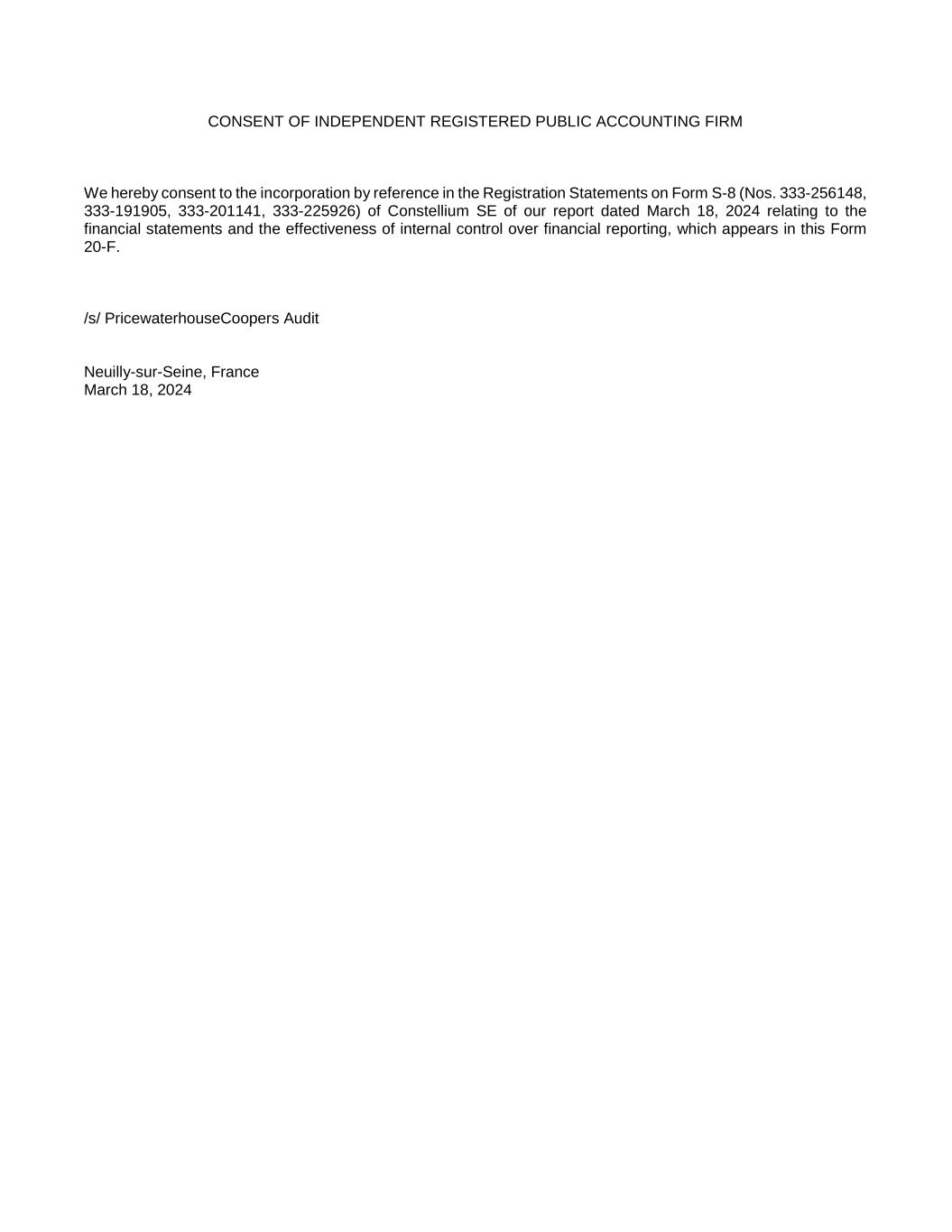 CONSENT OF INDEPENDENT REGISTERED PUBLIC ACCOUNTING FIRM We hereby consent to the incorporation by reference in the Registration Statements on Form S-8 (Nos. 333-256148, 333-191905, 333-201141, 333-225926) of Constellium SE of our report dated March 18, 2024 relating to the financial statements and the effectiveness of internal control over financial reporting, which appears in this Form 20-F. /s/ PricewaterhouseCoopers Audit Neuilly-sur-Seine, France March 18, 2024