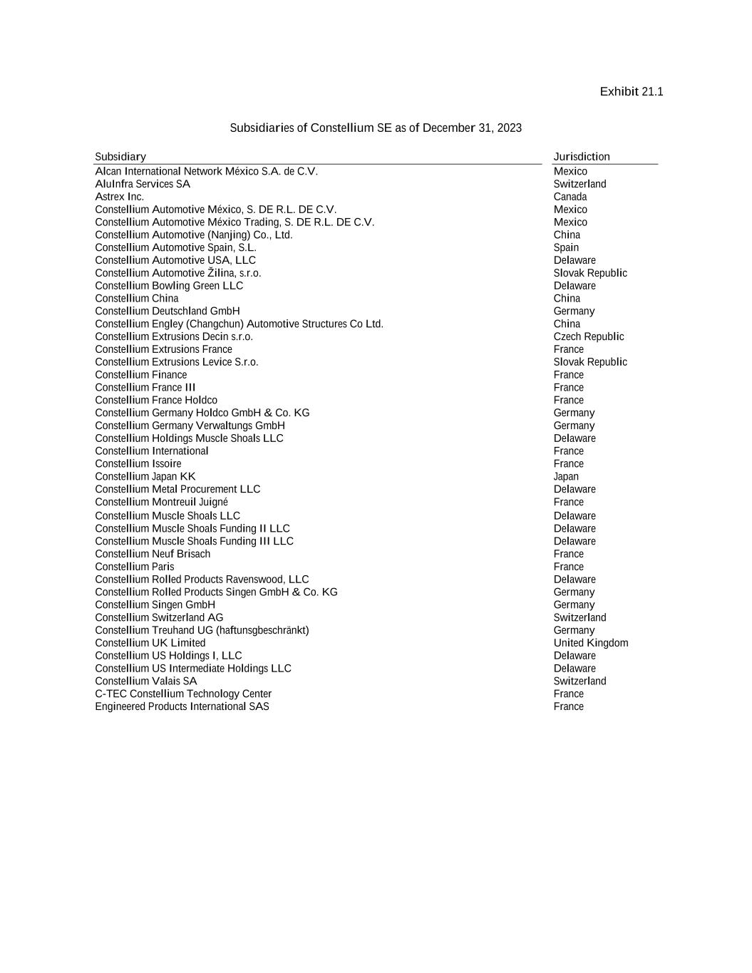 Exhibit 21.1 Subsidiaries of Constellium SE as of December 31, 2023 Subsidiary Jurisdiction Alcan International Network México S.A. de C.V. Mexico AluInfra Services SA Switzerland Astrex Inc. Canada Constellium Automotive México, S. DE R.L. DE C.V. Mexico Constellium Automotive México Trading, S. DE R.L. DE C.V. Mexico Constellium Automotive (Nanjing) Co., Ltd. China Constellium Automotive Spain, S.L. Spain Constellium Automotive USA, LLC Delaware Constellium Automotive Žilina, s.r.o. Slovak Republic Constellium Bowling Green LLC Delaware Constellium China China Constellium Deutschland GmbH Germany Constellium Engley (Changchun) Automotive Structures Co Ltd. China Constellium Extrusions Decin s.r.o. Czech Republic Constellium Extrusions France France Constellium Extrusions Levice S.r.o. Slovak Republic Constellium Finance France Constellium France III France Constellium France Holdco France Constellium Germany Holdco GmbH & Co. KG Germany Constellium Germany Verwaltungs GmbH Germany Constellium Holdings Muscle Shoals LLC Delaware Constellium International France Constellium Issoire France Constellium Japan KK Japan Constellium Metal Procurement LLC Constellium Montreuil Juigné Delaware France Constellium Muscle Shoals LLC Delaware Constellium Muscle Shoals Funding II LLC Delaware Constellium Muscle Shoals Funding III LLC Delaware Constellium Neuf Brisach France Constellium Paris France Constellium Rolled Products Ravenswood, LLC Delaware Constellium Rolled Products Singen GmbH & Co. KG Germany Constellium Singen GmbH Germany Constellium Switzerland AG Switzerland Constellium Treuhand UG (haftunsgbeschränkt) Germany Constellium UK Limited United Kingdom Constellium US Holdings I, LLC Delaware Constellium US Intermediate Holdings LLC Delaware Constellium Valais SA Switzerland C-TEC Constellium Technology Center France Engineered Products International SAS France