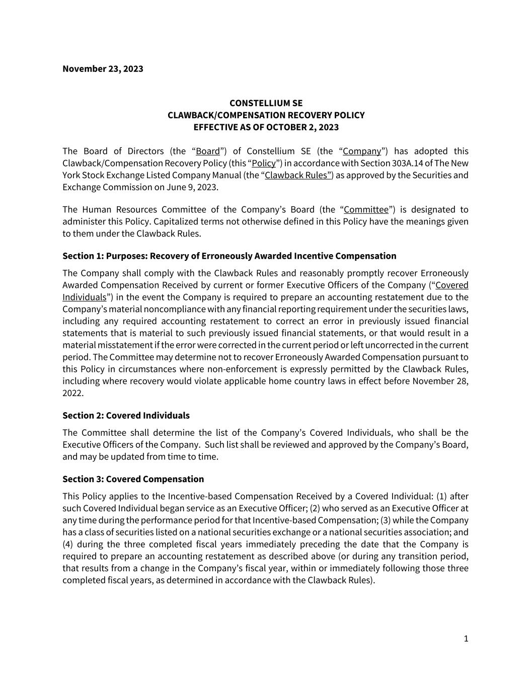 1 November 23, 2023 CONSTELLIUM SE CLAWBACK/COMPENSATION RECOVERY POLICY EFFECTIVE AS OF OCTOBER 2, 2023 The Board of Directors (the “Board”) of Constellium SE (the “Company”) has adopted this Clawback/Compensation Recovery Policy (this “Policy”) in accordance with Section 303A.14 of The New York Stock Exchange Listed Company Manual (the “Clawback Rules”) as approved by the Securities and Exchange Commission on June 9, 2023. The Human Resources Committee of the Company’s Board (the “Committee”) is designated to administer this Policy. Capitalized terms not otherwise defined in this Policy have the meanings given to them under the Clawback Rules. Section 1: Purposes: Recovery of Erroneously Awarded Incentive Compensation The Company shall comply with the Clawback Rules and reasonably promptly recover Erroneously Awarded Compensation Received by current or former Executive Officers of the Company (“Covered Individuals”) in the event the Company is required to prepare an accounting restatement due to the Company’s material noncompliance with any financial reporting requirement under the securities laws, including any required accounting restatement to correct an error in previously issued financial statements that is material to such previously issued financial statements, or that would result in a material misstatement if the error were corrected in the current period or left uncorrected in the current period. The Committee may determine not to recover Erroneously Awarded Compensation pursuant to this Policy in circumstances where non-enforcement is expressly permitted by the Clawback Rules, including where recovery would violate applicable home country laws in effect before November 28, 2022. Section 2: Covered Individuals The Committee shall determine the list of the Company’s Covered Individuals, who shall be the Executive Officers of the Company. Such list shall be reviewed and approved by the Company’s Board, and may be updated from time to time. Section 3: Covered Compensation This Policy applies to the Incentive-based Compensation Received by a Covered Individual: (1) after such Covered Individual began service as an Executive Officer; (2) who served as an Executive Officer at any time during the performance period for that Incentive-based Compensation; (3) while the Company has a class of securities listed on a national securities exchange or a national securities association; and (4) during the three completed fiscal years immediately preceding the date that the Company is required to prepare an accounting restatement as described above (or during any transition period, that results from a change in the Company’s fiscal year, within or immediately following those three completed fiscal years, as determined in accordance with the Clawback Rules).