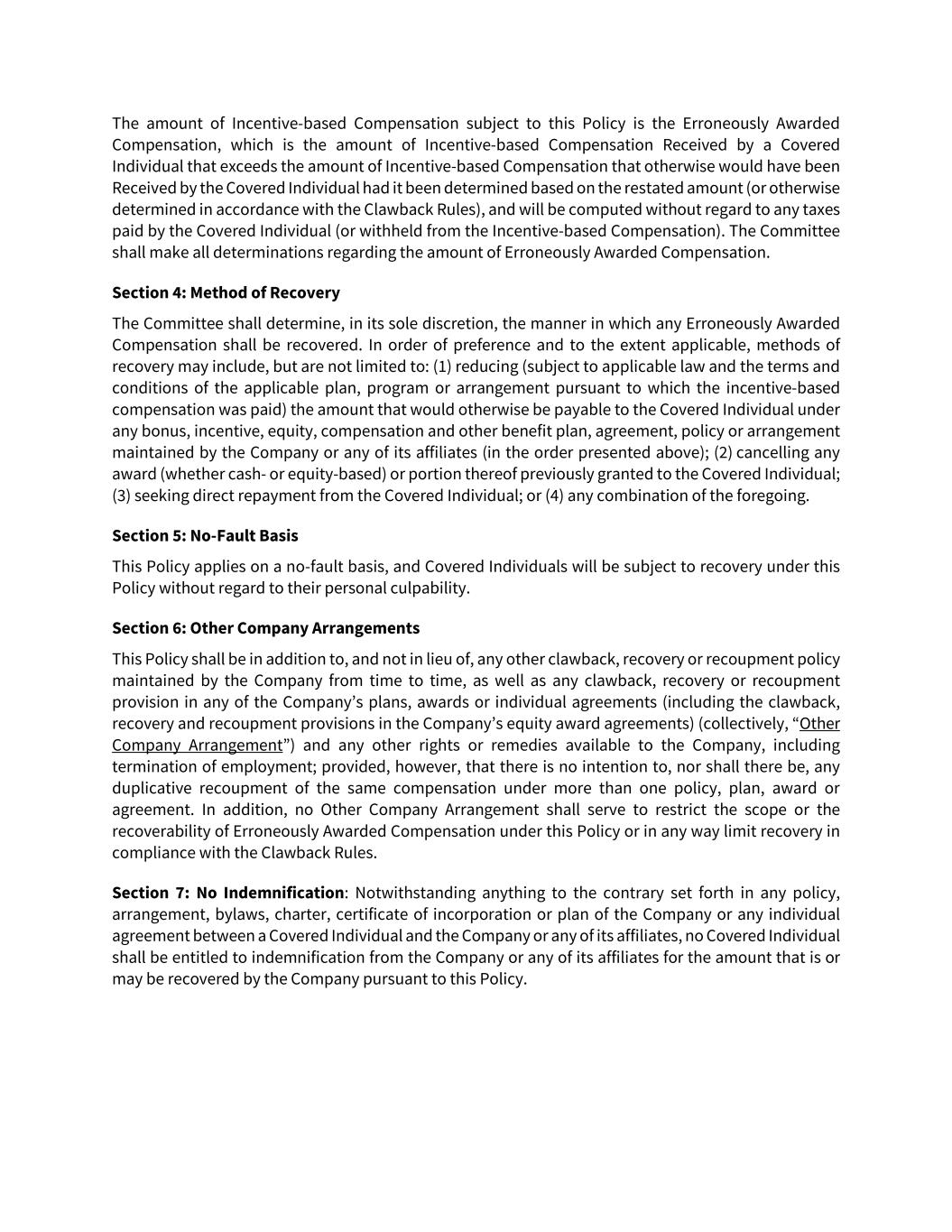 The amount of Incentive-based Compensation subject to this Policy is the Erroneously Awarded Compensation, which is the amount of Incentive-based Compensation Received by a Covered Individual that exceeds the amount of Incentive-based Compensation that otherwise would have been Received by the Covered Individual had it been determined based on the restated amount (or otherwise determined in accordance with the Clawback Rules), and will be computed without regard to any taxes paid by the Covered Individual (or withheld from the Incentive-based Compensation). The Committee shall make all determinations regarding the amount of Erroneously Awarded Compensation. Section 4: Method of Recovery The Committee shall determine, in its sole discretion, the manner in which any Erroneously Awarded Compensation shall be recovered. In order of preference and to the extent applicable, methods of recovery may include, but are not limited to: (1) reducing (subject to applicable law and the terms and conditions of the applicable plan, program or arrangement pursuant to which the incentive-based compensation was paid) the amount that would otherwise be payable to the Covered Individual under any bonus, incentive, equity, compensation and other benefit plan, agreement, policy or arrangement maintained by the Company or any of its affiliates (in the order presented above); (2) cancelling any award (whether cash- or equity-based) or portion thereof previously granted to the Covered Individual; (3) seeking direct repayment from the Covered Individual; or (4) any combination of the foregoing. Section 5: No-Fault Basis This Policy applies on a no-fault basis, and Covered Individuals will be subject to recovery under this Policy without regard to their personal culpability. Section 6: Other Company Arrangements This Policy shall be in addition to, and not in lieu of, any other clawback, recovery or recoupment policy maintained by the Company from time to time, as well as any clawback, recovery or recoupment provision in any of the Company’s plans, awards or individual agreements (including the clawback, recovery and recoupment provisions in the Company’s equity award agreements) (collectively, “Other Company Arrangement”) and any other rights or remedies available to the Company, including termination of employment; provided, however, that there is no intention to, nor shall there be, any duplicative recoupment of the same compensation under more than one policy, plan, award or agreement. In addition, no Other Company Arrangement shall serve to restrict the scope or the recoverability of Erroneously Awarded Compensation under this Policy or in any way limit recovery in compliance with the Clawback Rules. Section 7: No Indemnification: Notwithstanding anything to the contrary set forth in any policy, arrangement, bylaws, charter, certificate of incorporation or plan of the Company or any individual agreement between a Covered Individual and the Company or any of its affiliates, no Covered Individual shall be entitled to indemnification from the Company or any of its affiliates for the amount that is or may be recovered by the Company pursuant to this Policy.