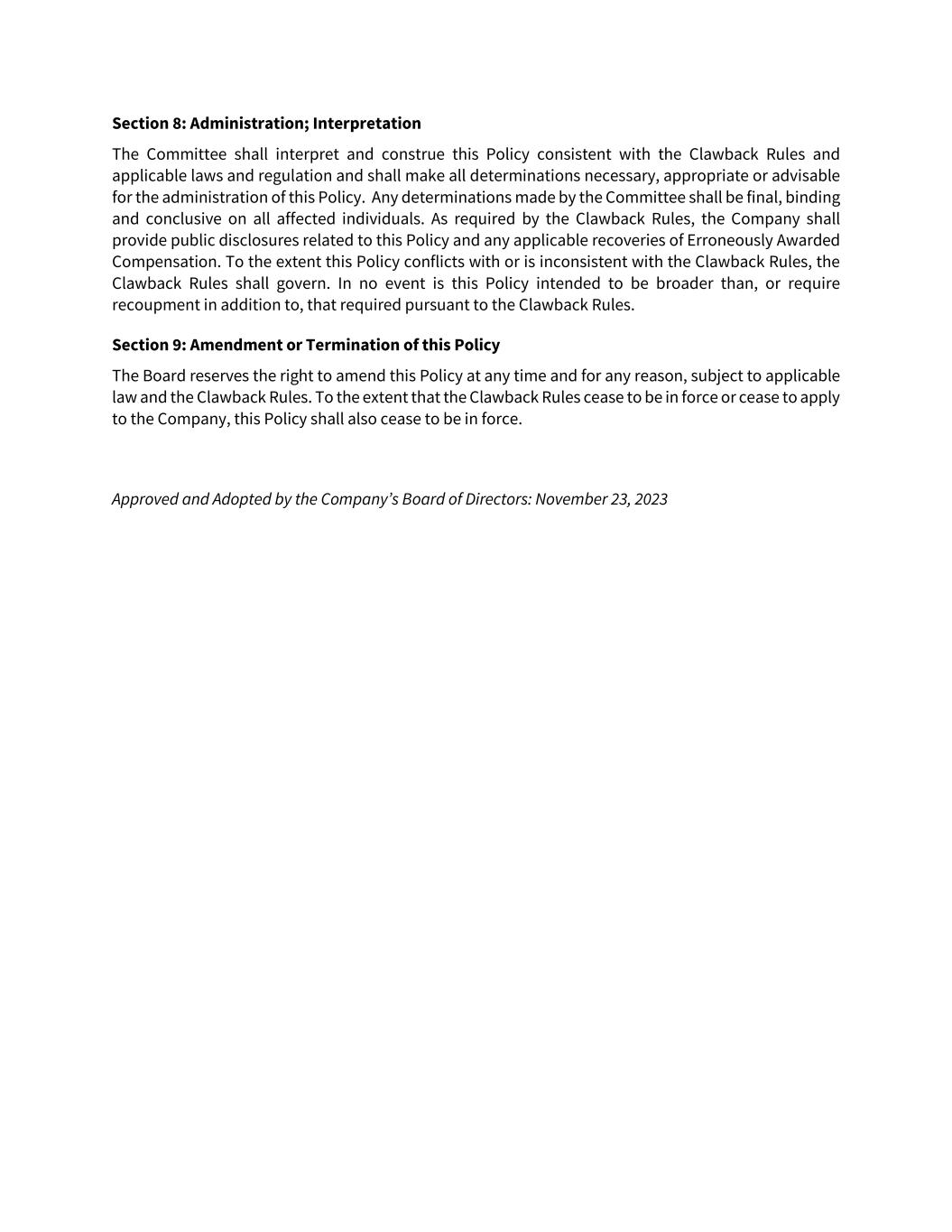 Section 8: Administration; Interpretation The Committee shall interpret and construe this Policy consistent with the Clawback Rules and applicable laws and regulation and shall make all determinations necessary, appropriate or advisable for the administration of this Policy. Any determinations made by the Committee shall be final, binding and conclusive on all affected individuals. As required by the Clawback Rules, the Company shall provide public disclosures related to this Policy and any applicable recoveries of Erroneously Awarded Compensation. To the extent this Policy conflicts with or is inconsistent with the Clawback Rules, the Clawback Rules shall govern. In no event is this Policy intended to be broader than, or require recoupment in addition to, that required pursuant to the Clawback Rules. Section 9: Amendment or Termination of this Policy The Board reserves the right to amend this Policy at any time and for any reason, subject to applicable law and the Clawback Rules. To the extent that the Clawback Rules cease to be in force or cease to apply to the Company, this Policy shall also cease to be in force. Approved and Adopted by the Company’s Board of Directors: November 23, 2023