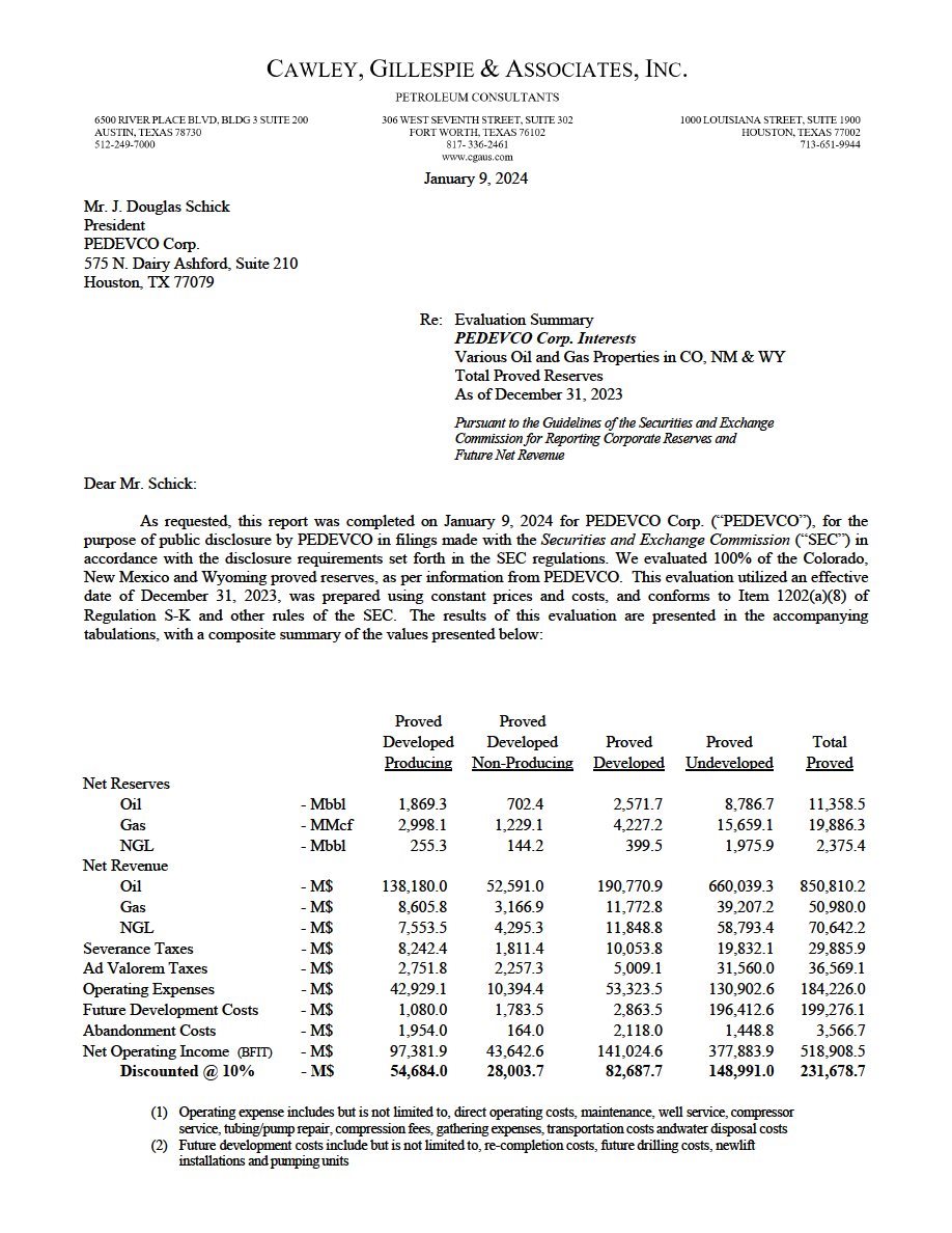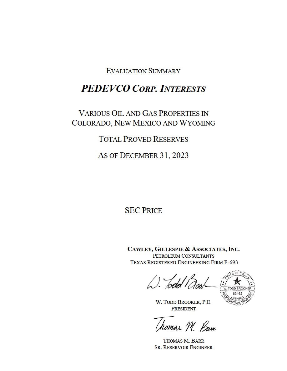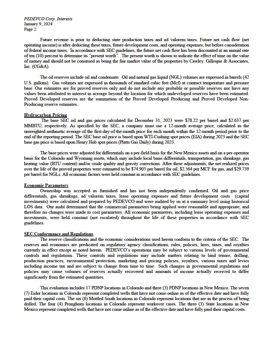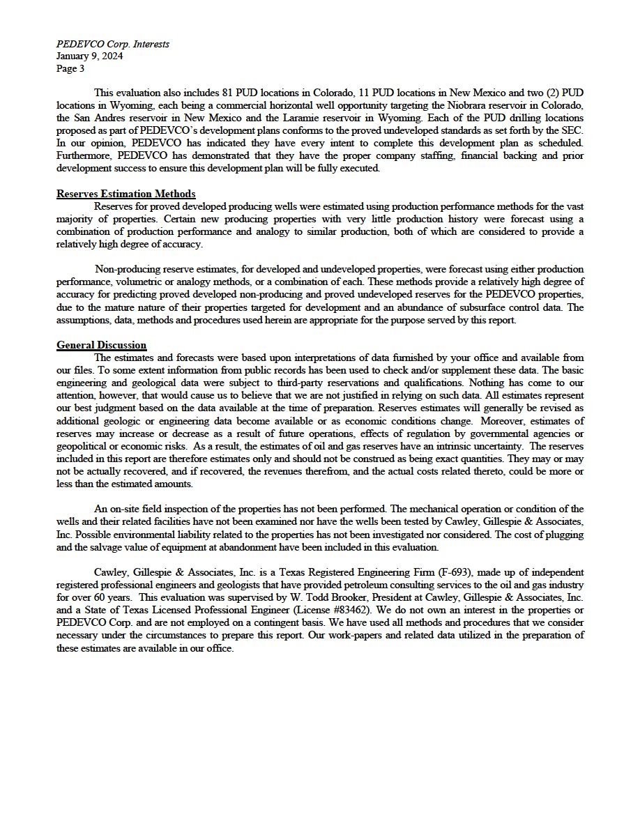 We further consent to the inclusion and use in the Annual Report of our report dated January 9, 2024, entitled “PEDEVCO Corp. Interests – Various Oil and Gas Properties in Colorado, New Mexico and Wyoming – Total Proved Reserves as of December 31, 2023” (the “Report”), and the information from our Report contained in the Annual Report, the incorporation by reference of the Report in the Annual Report, and the filing of the Report as Exhibit 99.1 to the Annual Report.