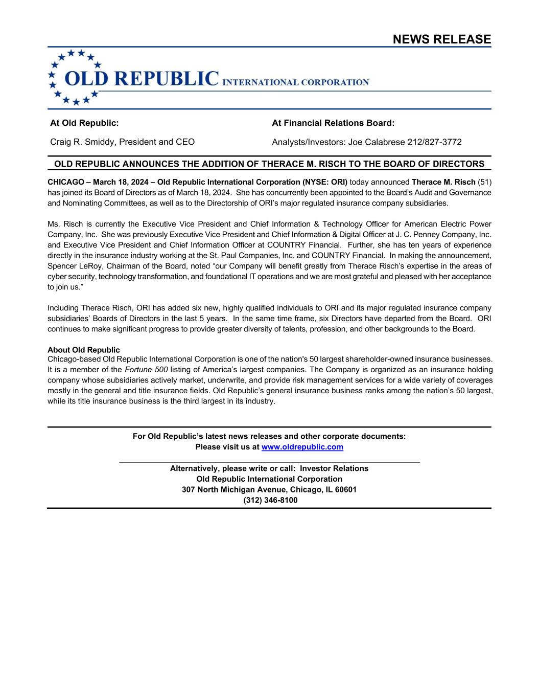 NEWS RELEASE At Old Republic: At Financial Relations Board: Craig R. Smiddy, President and CEO Analysts/Investors: Joe Calabrese 212/827-3772 OLD REPUBLIC ANNOUNCES THE ADDITION OF THERACE M. RISCH TO THE BOARD OF DIRECTORS CHICAGO – March 18, 2024 – Old Republic International Corporation (NYSE: ORI) today announced Therace M. Risch (51) has joined its Board of Directors as of March 18, 2024. She has concurrently been appointed to the Board’s Audit and Governance and Nominating Committees, as well as to the Directorship of ORI’s major regulated insurance company subsidiaries. Ms. Risch is currently the Executive Vice President and Chief Information & Technology Officer for American Electric Power Company, Inc. She was previously Executive Vice President and Chief Information & Digital Officer at J. C. Penney Company, Inc. and Executive Vice President and Chief Information Officer at COUNTRY Financial. Further, she has ten years of experience directly in the insurance industry working at the St. Paul Companies, Inc. and COUNTRY Financial. In making the announcement, Spencer LeRoy, Chairman of the Board, noted “our Company will benefit greatly from Therace Risch’s expertise in the areas of cyber security, technology transformation, and foundational IT operations and we are most grateful and pleased with her acceptance to join us.” Including Therace Risch, ORI has added six new, highly qualified individuals to ORI and its major regulated insurance company subsidiaries’ Boards of Directors in the last 5 years. In the same time frame, six Directors have departed from the Board. ORI continues to make significant progress to provide greater diversity of talents, profession, and other backgrounds to the Board. About Old Republic Chicago-based Old Republic International Corporation is one of the nation's 50 largest shareholder-owned insurance businesses. It is a member of the Fortune 500 listing of America’s largest companies. The Company is organized as an insurance holding company whose subsidiaries actively market, underwrite, and provide risk management services for a wide variety of coverages mostly in the general and title insurance fields. Old Republic’s general insurance business ranks among the nation’s 50 largest, while its title insurance business is the third largest in its industry. For Old Republic’s latest news releases and other corporate documents: Please visit us at www.oldrepublic.com Alternatively, please write or call: Investor Relations Old Republic International Corporation 307 North Michigan Avenue, Chicago, IL 60601 (312) 346-8100