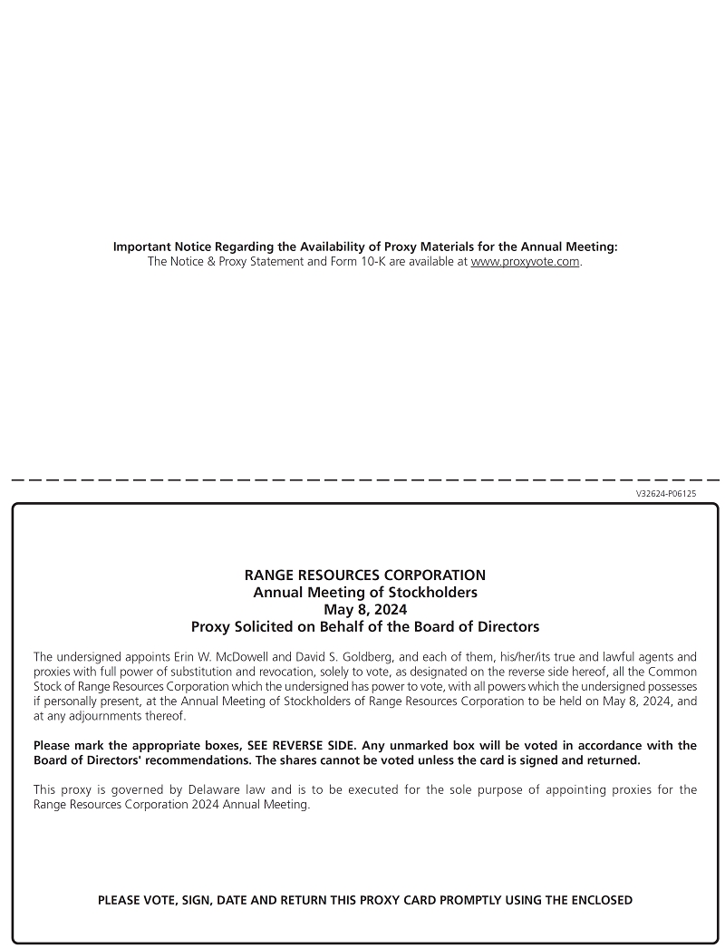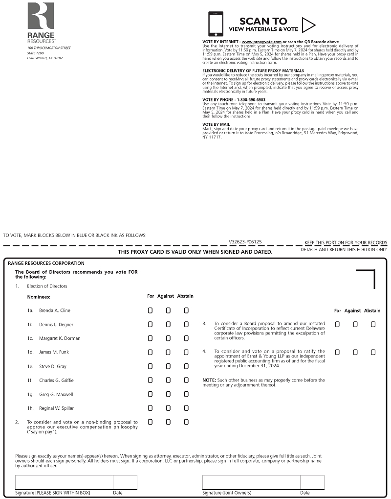 On behalf of the Board of Directors (the “Board”), we are pleased to invite you to participate in Range Resources’ 2024 Annual Meeting of Stockholders (the “Annual Meeting” or the “Meeting”). Our Annual Meeting will be held telephonically, commencing at 8:00 a.m., Central Time, on Wednesday, May 8, 2024. To access the event you will need to register virtually at https://ir.rangeresources.com/events/event-details/2024-annual-meeting-stockholders. The attached Notice of 2024 Annual Meeting of Stockholders and Proxy Statement provide information about the business we plan to conduct.