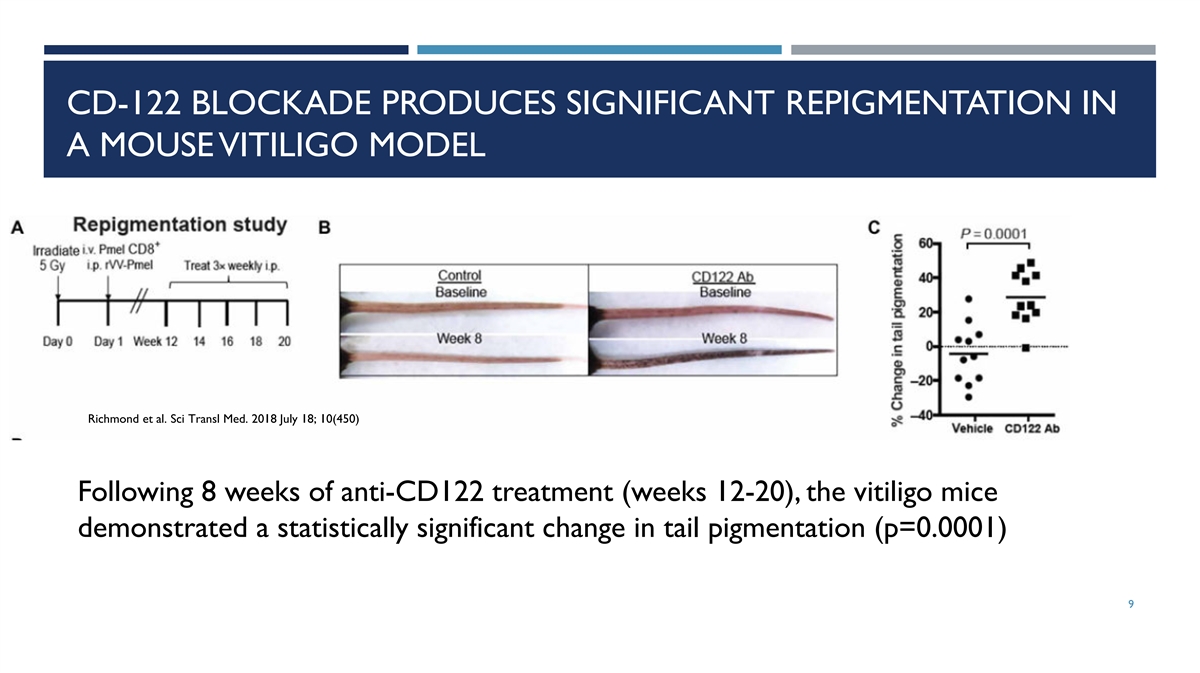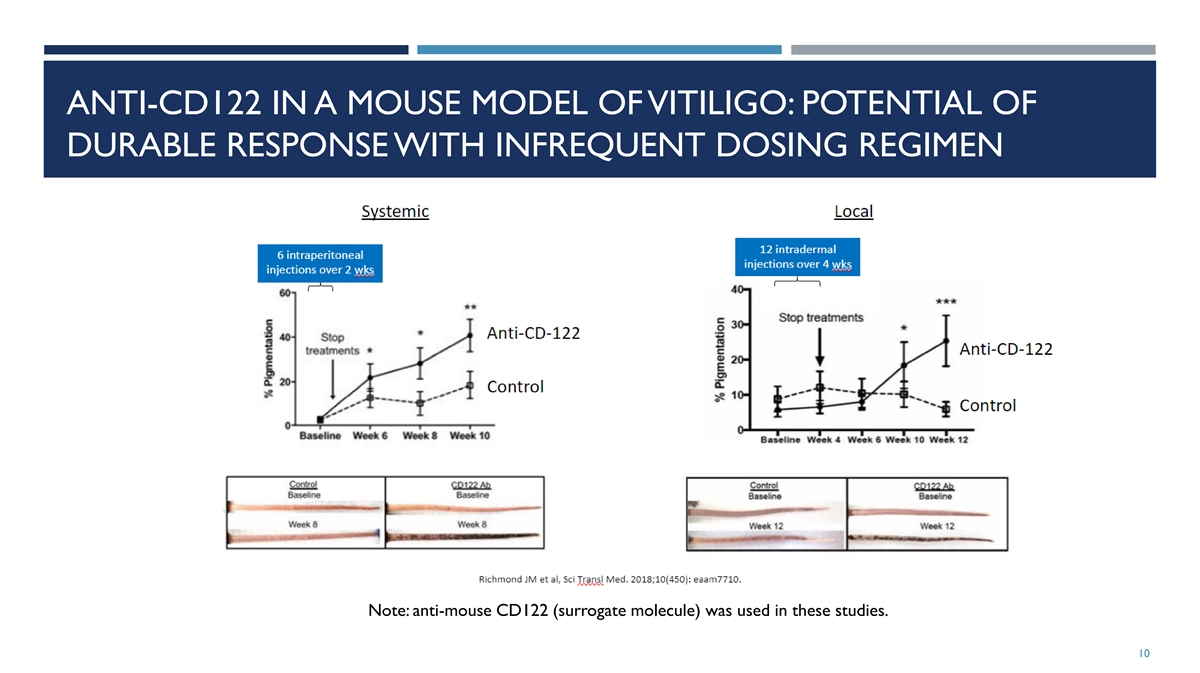 CD-122 BLOCKADE PRODUCES SIGNIFICANT REPIGMENTATION IN A MOUSE VITILIGO MODEL Richmond et al. Sci Transl Med. 2018 July 18; 10(450) Following 8 weeks of anti-CD122 treatment (weeks 12-20), the vitiligo mice demonstrated a statistically significant change in tail pigmentation (p=0.0001) 9