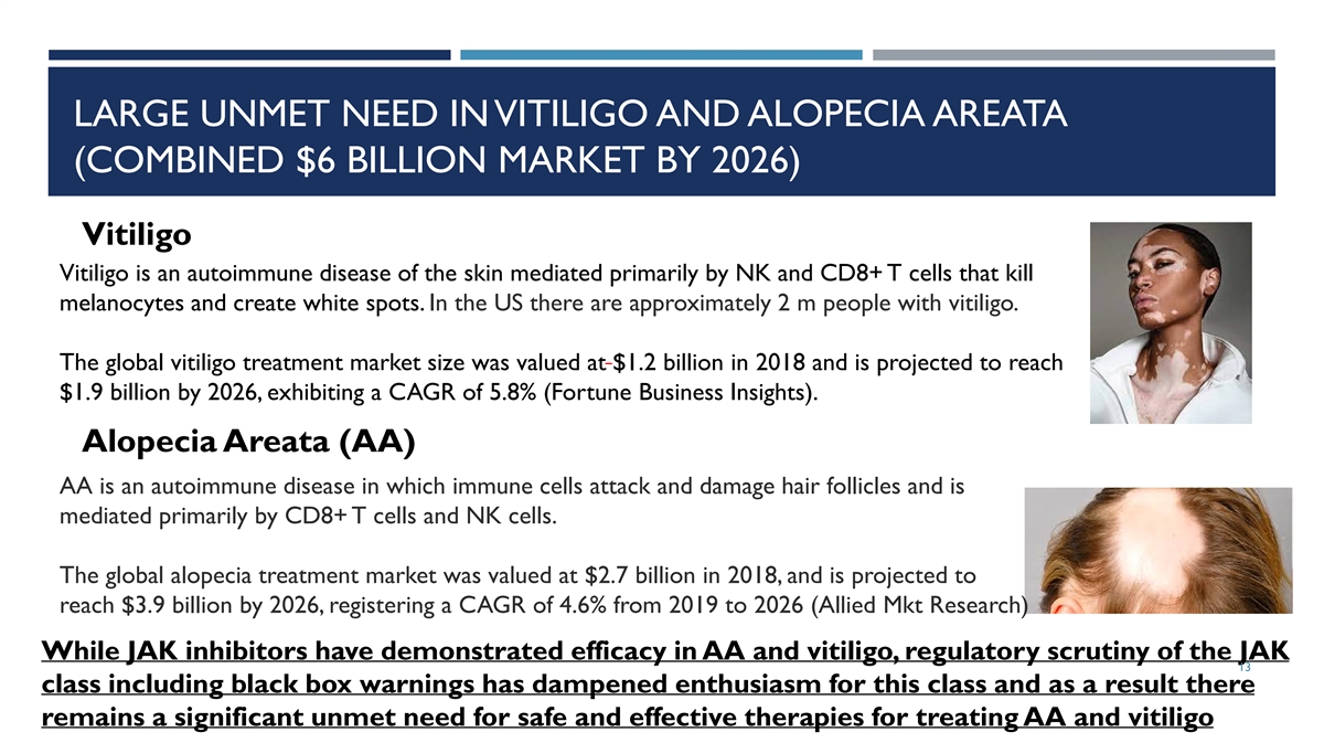 LARGE UNMET NEED IN VITILIGO AND ALOPECIA AREATA (COMBINED $6 BILLION MARKET BY 2026) Vitiligo Vitiligo is an autoimmune disease of the skin mediated primarily by NK and CD8+ T cells that kill melanocytes and create white spots. In the US there are approximately 2 m people with vitiligo. The global vitiligo treatment market size was valued at $1.2 billion in 2018 and is projected to reach $1.9 billion by 2026, exhibiting a CAGR of 5.8% (Fortune Business Insights). Alopecia Areata (AA) AA is an autoimmune disease in which immune cells attack and damage hair follicles and is mediated primarily by CD8+ T cells and NK cells. The global alopecia treatment market was valued at $2.7 billion in 2018, and is projected to reach $3.9 billion by 2026, registering a CAGR of 4.6% from 2019 to 2026 (Allied Mkt Research) While JAK inhibitors have demonstrated efficacy in AA and vitiligo, regulatory scrutiny of the JAK 13 class including black box warnings has dampened enthusiasm for this class and as a result there remains a significant unmet need for safe and effective therapies for treating AA and vitiligo