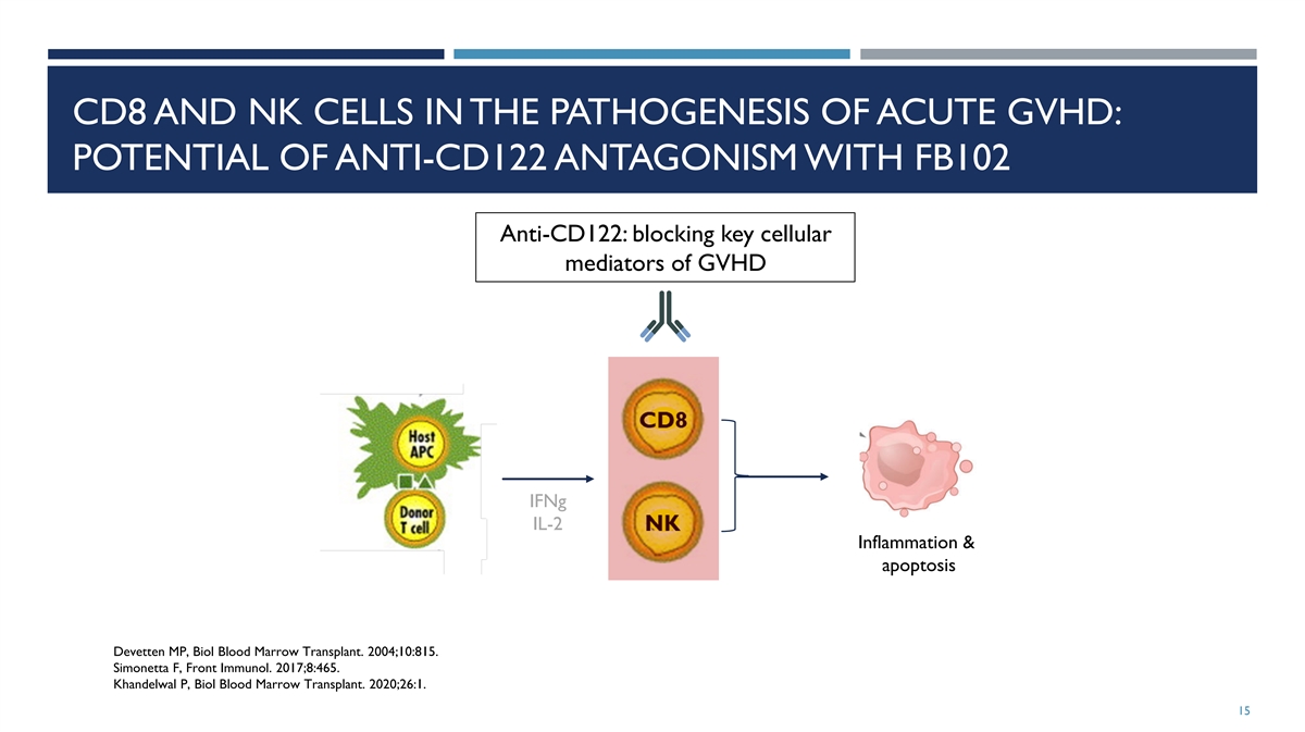CD8 AND NK CELLS IN THE PATHOGENESIS OF ACUTE GVHD: POTENTIAL OF ANTI-CD122 ANTAGONISM WITH FB102 Anti-CD122: blocking key cellular mediators of GVHD IFNg IL-2 Inflammation & apoptosis Devetten MP, Biol Blood Marrow Transplant. 2004;10:815. Simonetta F, Front Immunol. 2017;8:465. Khandelwal P, Biol Blood Marrow Transplant. 2020;26:1. 15
