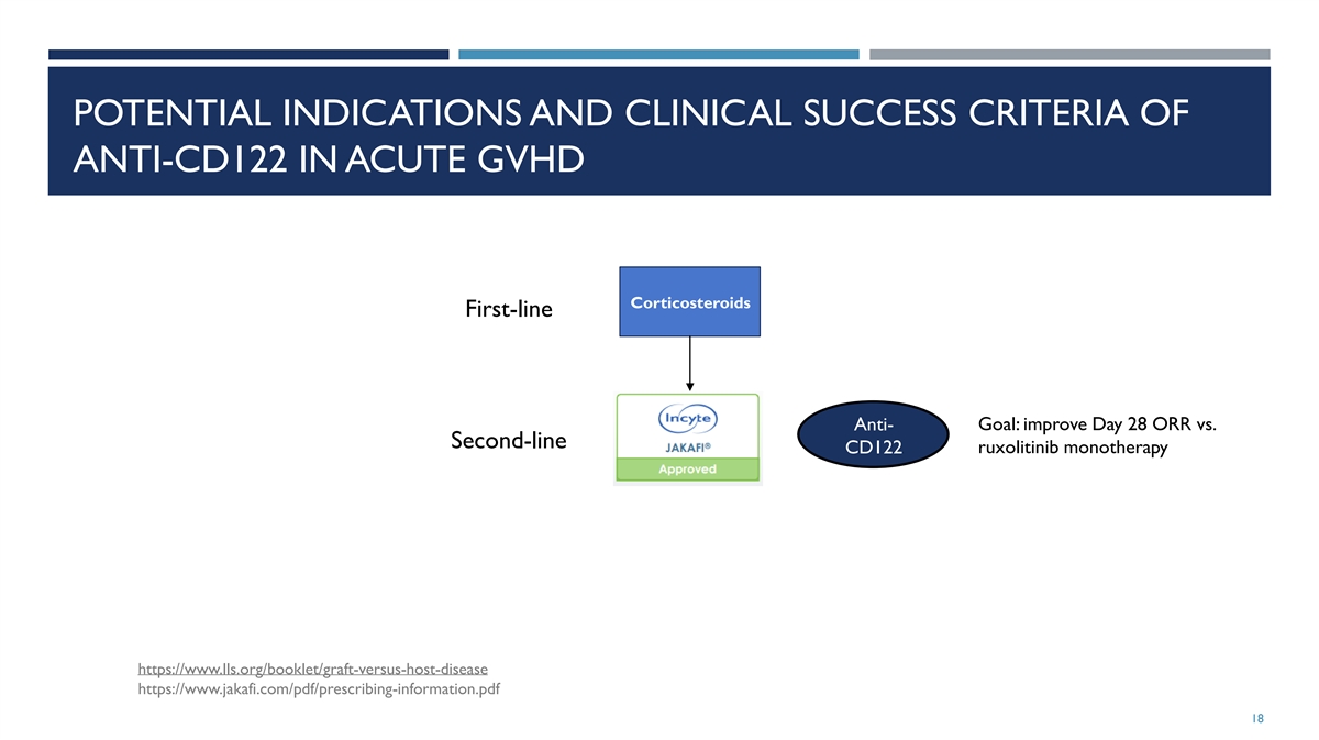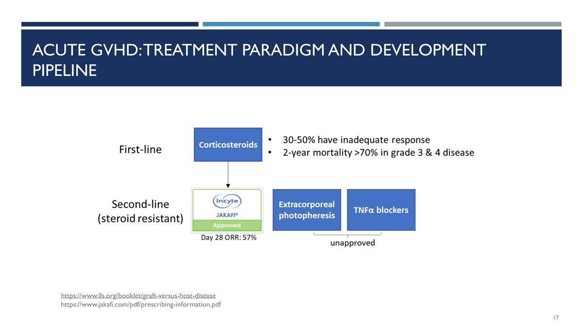 ACUTE GVHD: TREATMENT PARADIGM AND DEVELOPMENT PIPELINE https://www.lls.org/booklet/graft-versus-host-disease https://www.jakafi.com/pdf/prescribing-information.pdf 17