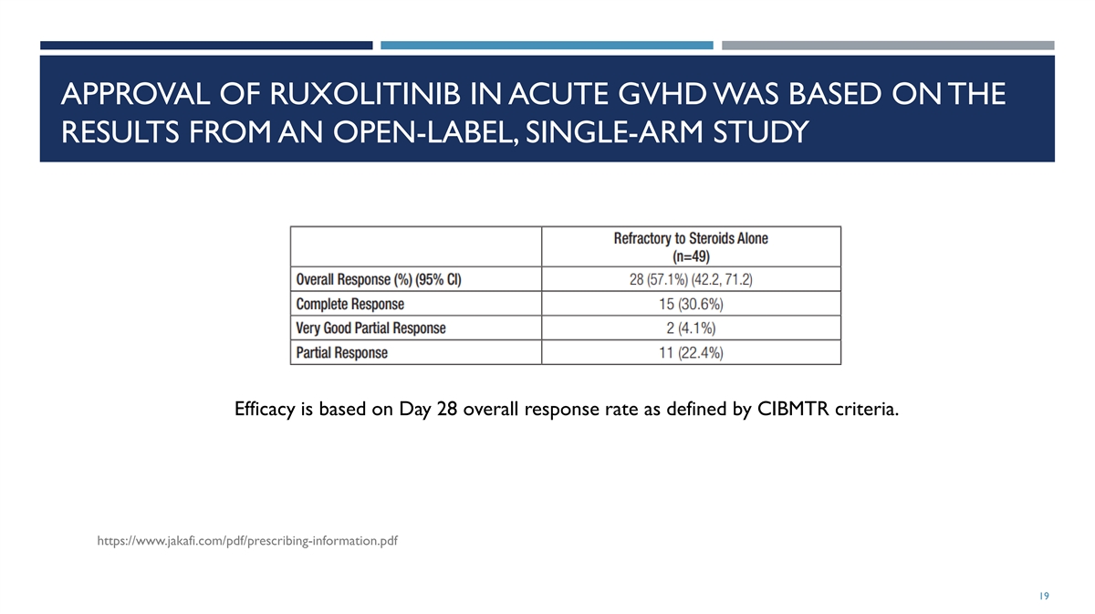 APPROVAL OF RUXOLITINIB IN ACUTE GVHD WAS BASED ON THE RESULTS FROM AN OPEN-LABEL, SINGLE-ARM STUDY Efficacy is based on Day 28 overall response rate as defined by CIBMTR criteria. https://www.jakafi.com/pdf/prescribing-information.pdf 19