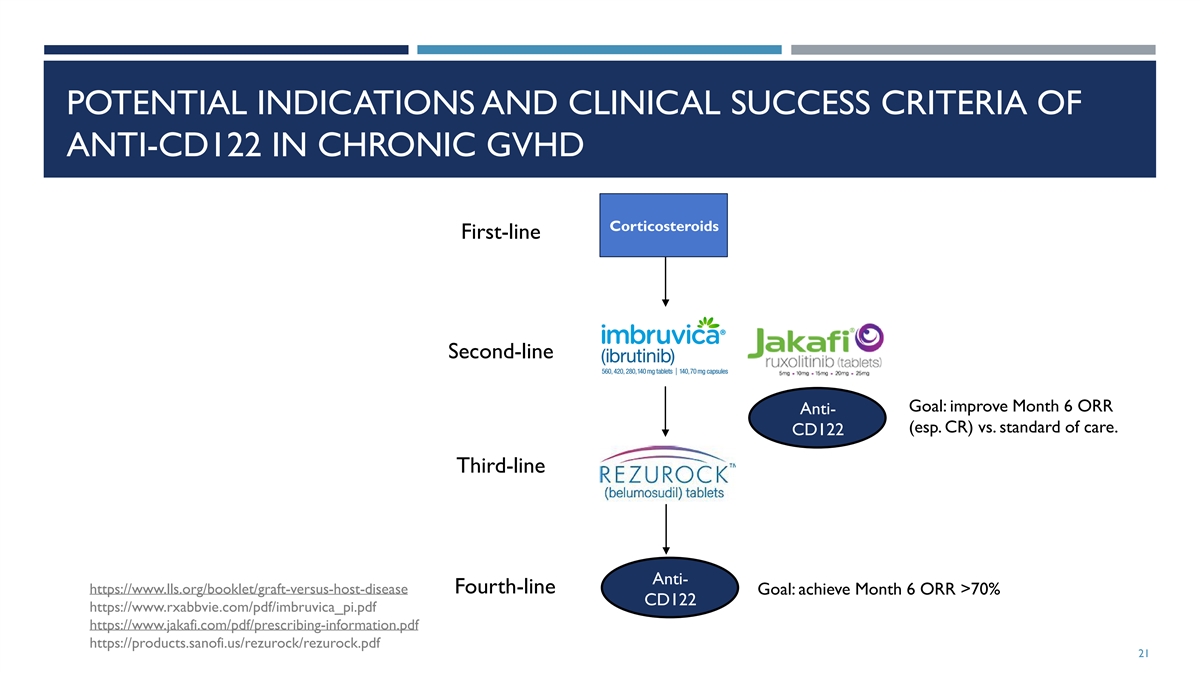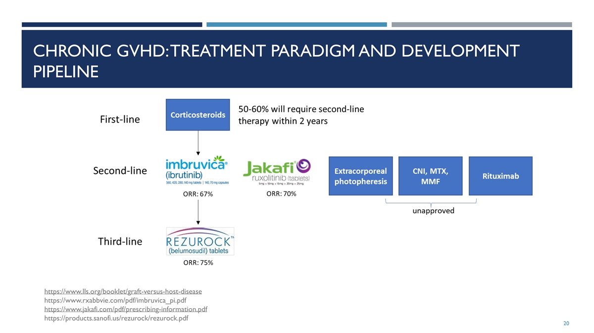 CHRONIC GVHD: TREATMENT PARADIGM AND DEVELOPMENT PIPELINE https://www.lls.org/booklet/graft-versus-host-disease https://www.rxabbvie.com/pdf/imbruvica_pi.pdf https://www.jakafi.com/pdf/prescribing-information.pdf https://products.sanofi.us/rezurock/rezurock.pdf 20
