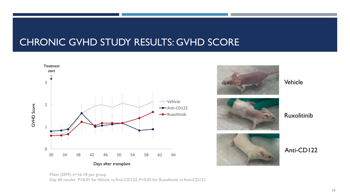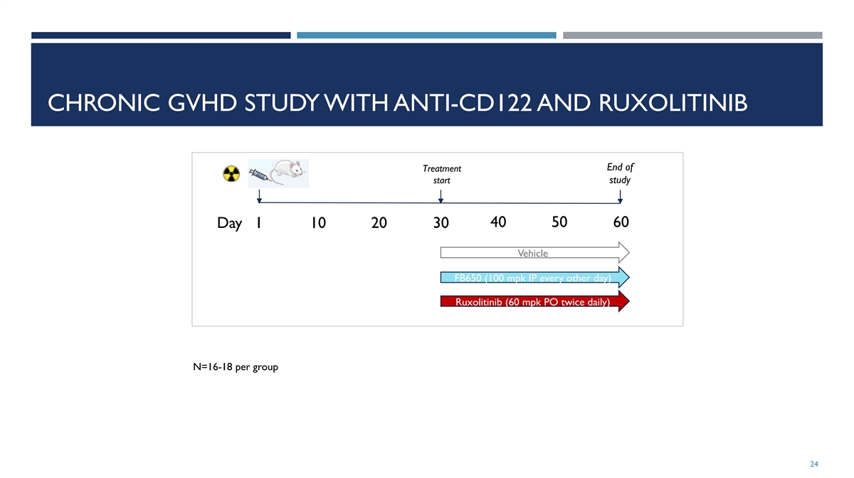 CHRONIC GVHD STUDY WITH ANTI-CD122 AND RUXOLITINIB End of Treatment start study 40 50 60 Day 1 10 20 30 Vehicle FB650 (100 mpk IP every other day) Ruxolitinib (60 mpk PO twice daily) N=16-18 per group 24