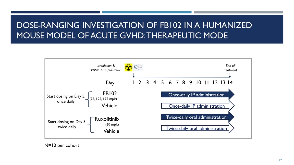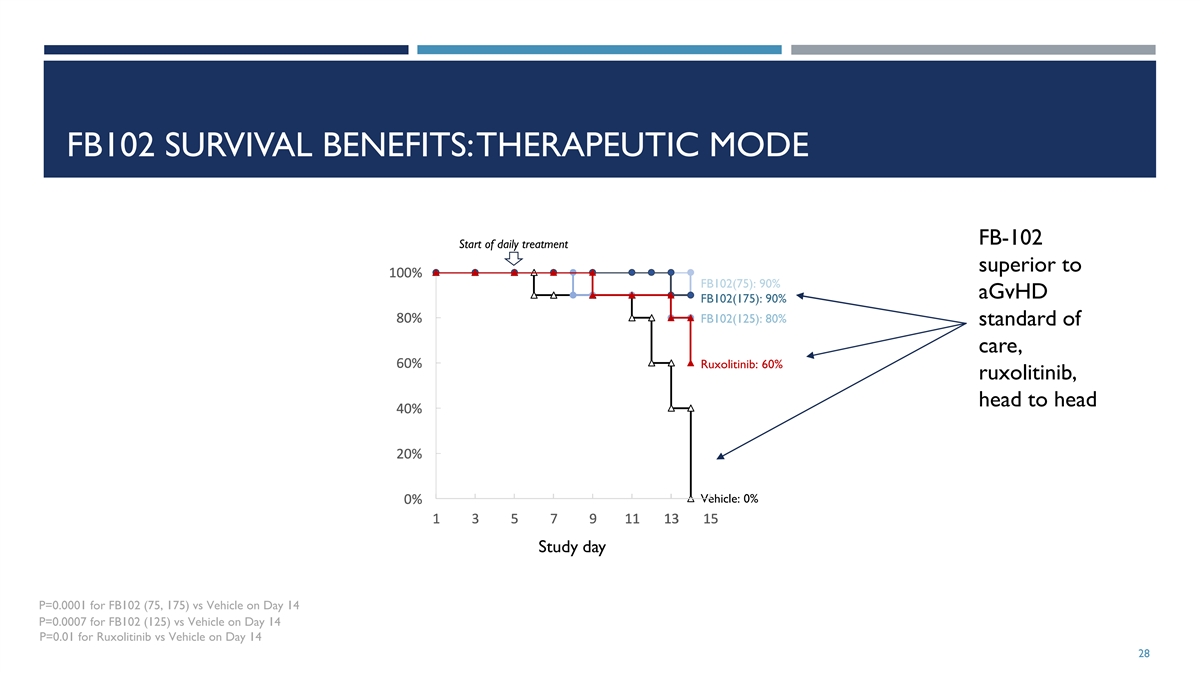 DOSE-RANGING INVESTIGATION OF FB102 IN A HUMANIZED MOUSE MODEL OF ACUTE GVHD: THERAPEUTIC MODE Irradiation & End of PBMC transplantation treatment 1 2 3 4 5 6 8 10 12 13 14 Day 7 9 11 FB102 Once-daily IP administration Start dosing on Day 5, (75, 125, 175 mpk) once daily Vehicle Once-daily IP administration Twice-daily oral administration Ruxolitinib Start dosing on Day 5, (60 mpk) twice daily Twice-daily oral administration Vehicle N=10 per cohort 27