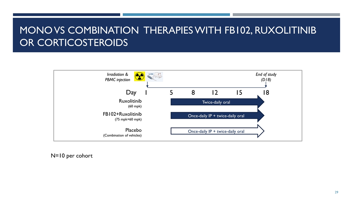 MONO VS COMBINATION THERAPIES WITH FB102, RUXOLITINIB OR CORTICOSTEROIDS Irradiation & End of study PBMC injection (D18) Day 1 5 8 12 15 18 Ruxolitinib Twice-daily oral (60 mpk) FB102+Ruxolitinib Once-daily IP + twice-daily oral (75 mpk+60 mpk) Placebo Once-daily IP + twice-daily oral (Combination of vehicles) N=10 per cohort 29