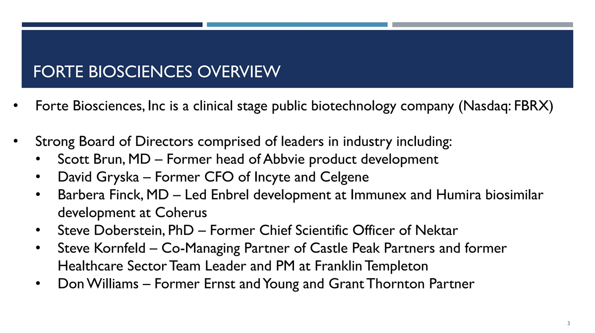 CAUTIONARY NOTE REGARDING FORWARD-LOOKING STATEMENTS ¡ Certain statements contained in this presentation regarding matters that are not historical facts, are forward-looking statements within the meaning of Section 21E of the Securities and Exchange Act of 1934, as amended, and the Private Securities Litigation Act of 1995, known as the PSLRA. These include statements regarding management’s intention, plans, beliefs, expectations or forecasts for the future, and, therefore, you are cautioned not to place undue reliance on them. No forward-looking statement can be guaranteed, and actual results may differ materially from those projected. Forte Biosciences, Inc. (“we”, the “Company” or “Forte”) undertakes no obligation to publicly update any forward-looking statement, whether as a result of new information, future events or otherwise, except to the extent required by law. We use words such as “anticipates,” “believes,” “plans,” “expects,” “projects,” “intends,” “may,” “will,” “should,” “could,” “estimates,” “predicts,” “potential,” “continue,” “guidance,” and similar expressions to identify these forward-looking statements that are intended to be covered by the safe-harbor provisions of the PSLRA. ¡ Such forward-looking statements are based on our expectations and involve risks and uncertainties; consequently, actual results may differ materially from those expressed or implied in the statements due to a number of factors, including, but not limited to, risks relating to the business and prospects of the Company; Forte’s plans to develop and potentially commercialize its product candidates, including FB-102; the risk that results from early-preclinical studies may not be predictive of results from later-stage studies or clinical trials; the timing of initiation of Forte’s planned clinical trials; the timing of the availability of data from Forte’s clinical trials; the timing of any planned investigational new drug application or new drug application; Forte’s plans to research, develop and commercialize its current and future product candidates; Forte’s projections of the size of the market for FB-102; Forte’s ability to successfully enter into collaborations, and to fulfill its obligations under any such collaboration agreements; the clinical utility, potential benefits and market acceptance of Forte’s product candidates; Forte’s commercialization, marketing and manufacturing capabilities and strategy; developments and projections relating to Forte’s competitors and its industry; the impact of government laws and regulations; Forte’s ability to protect its intellectual property position; Forte’s estimates regarding future revenue, expenses, capital requirements and need for additional financing; and the impact of global events on the Company, the Company’s industry or the economy generally. ¡ We have based these forward-looking statements largely on our current expectations and projections about future events and trends that we believe may affect our financial condition, results of operations, business strategy and financial needs, and these statements represent our views as of the date of this presentation. We may not actually achieve the plans, intentions or expectations disclosed in these forward-looking statements, and you should not place undue reliance on these forward-looking statements. Forward-looking statements are inherently subject to risks and uncertainties, some of which cannot be predicted or quantified. Information regarding certain risks, uncertainties and assumptions may be found in our filings with the Securities and Exchange Commission, including under the caption “Risk Factors” and elsewhere in our Annual Report on Form 10-K for the year ending December 31, 2023 and other filings with the Securities and Exchange Commission. New risk factors emerge from time to time and it is not possible for our management team to predict all risk factors or assess the impact of all factors on the business or the extent to which any factor, or combination of factors, may cause actual results to differ materially from those contained in, or implied by, any forward-looking statements. While we may elect to update these forward-looking statements at some point in the future, we specifically disclaim any obligation to do so. These forward-looking statements should not be relied upon as representing our views as of any date subsequent to the date of this presentation. 2
