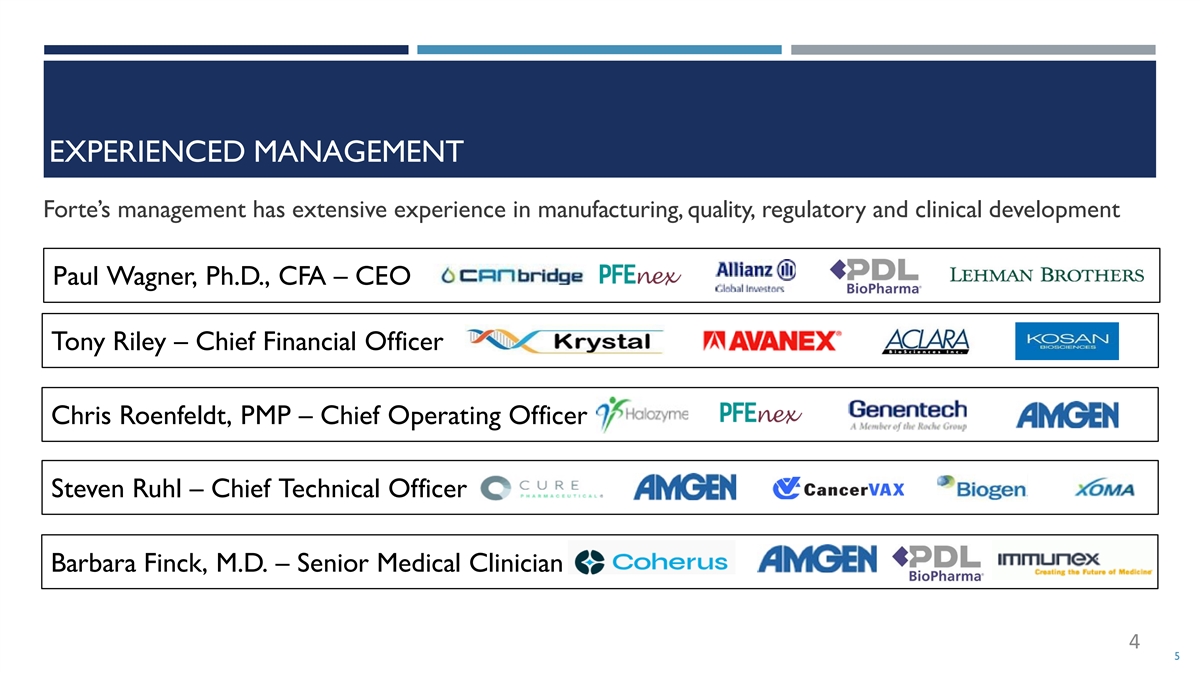 EXPERIENCED MANAGEMENT Forte’s management has extensive experience in manufacturing, quality, regulatory and clinical development Paul Wagner, Ph.D., CFA – CEO Tony Riley – Chief Financial Officer Chris Roenfeldt, PMP – Chief Operating Officer Steven Ruhl – Chief Technical Officer Barbara Finck, M.D. – Senior Medical Clinician 4 5