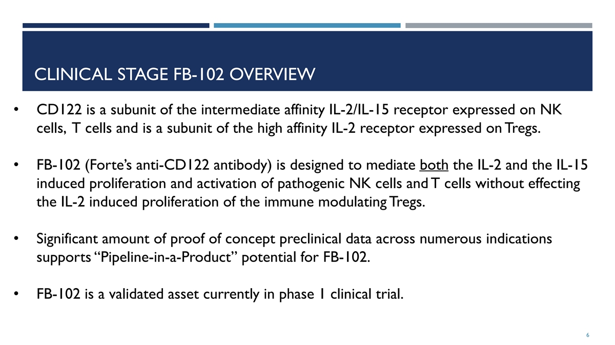 CLINICAL STAGE FB-102 OVERVIEW • CD122 is a subunit of the intermediate affinity IL-2/IL-15 receptor expressed on NK cells, T cells and is a subunit of the high affinity IL-2 receptor expressed on Tregs. • FB-102 (Forte’s anti-CD122 antibody) is designed to mediate both the IL-2 and the IL-15 induced proliferation and activation of pathogenic NK cells and T cells without effecting the IL-2 induced proliferation of the immune modulating Tregs. • Significant amount of proof of concept preclinical data across numerous indications supports “Pipeline-in-a-Product” potential for FB-102. • FB-102 is a validated asset currently in phase 1 clinical trial. 32