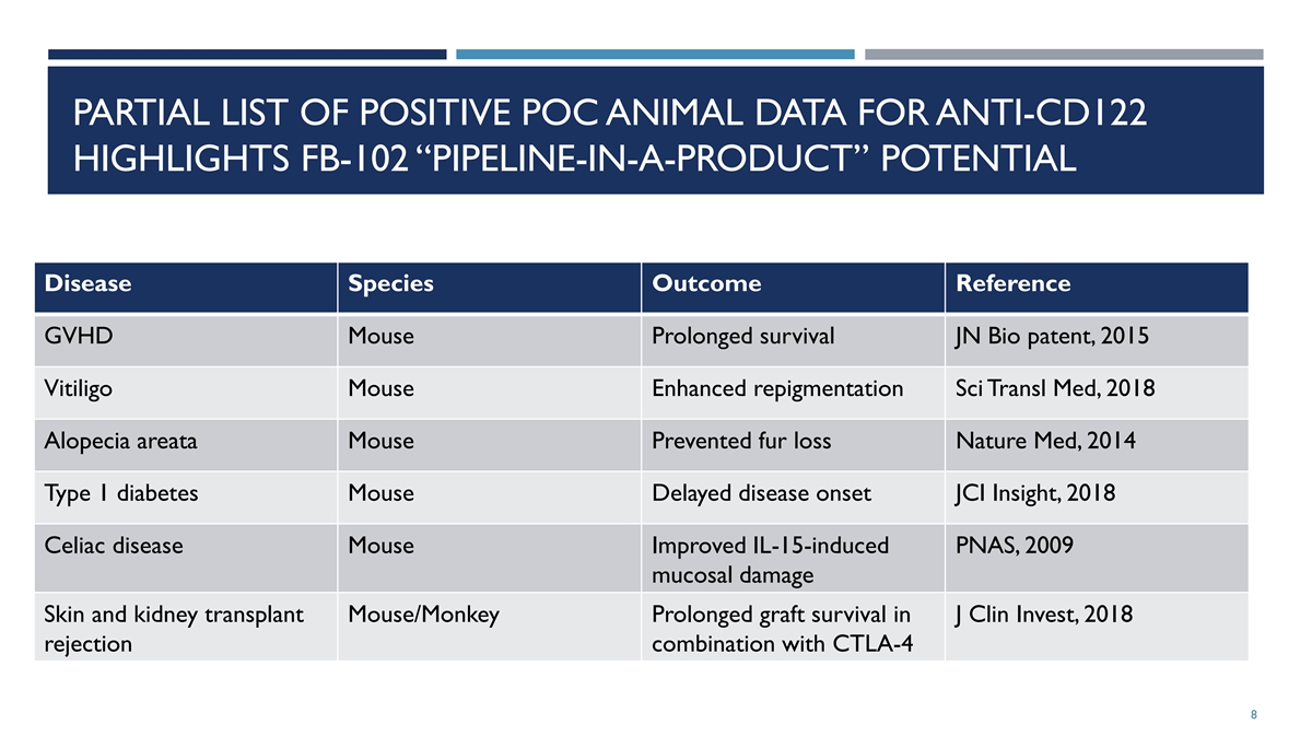 PARTIAL LIST OF POSITIVE POC ANIMAL DATA FOR ANTI-CD122 HIGHLIGHTS FB-102 “PIPELINE-IN-A-PRODUCT” POTENTIAL Disease Species Outcome Reference GVHD Mouse Prolonged survival JN Bio patent, 2015 Vitiligo Mouse Enhanced repigmentation Sci Transl Med, 2018 Alopecia areata Mouse Prevented fur loss Nature Med, 2014 Type 1 diabetes Mouse Delayed disease onset JCI Insight, 2018 Celiac disease Mouse Improved IL-15-induced PNAS, 2009 mucosal damage Skin and kidney transplant Mouse/Monkey Prolonged graft survival in J Clin Invest, 2018 rejection combination with CTLA-4 8