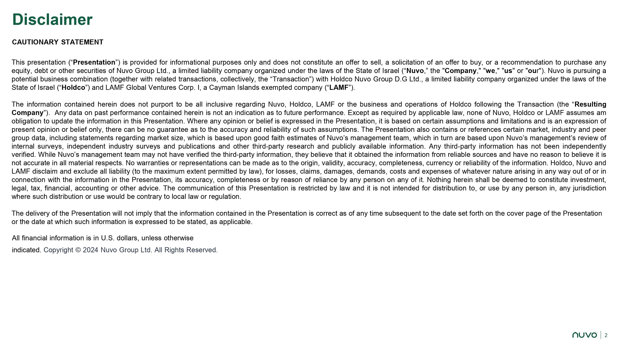 CAUTIONARY STATEMENT This presentation (“ Presentation ”) is provided for informational purposes only and does not constitute an offer to sell, a solicitation of an offer to buy, or a recommendation to purchase any equity, debt or other securities of Nuvo Group Ltd . , a limited liability company organized under the laws of the State of Israel (“ Nuvo ,” the " Company ," " we ," " us " or " ou r") . Nuvo is pursuing a potential business combination (together with related transactions, collectively, the “Transaction”) with Holdco Nuvo Group D . G Ltd . , a limited liability company organized under the laws of the State of Israel (“ Holdco ”) and LAMF Global Ventures Corp . I, a Cayman Islands exempted company (“ LAMF ”) . The information contained herein does not purport to be all inclusive regarding Nuvo, Holdco, LAMF or the business and operations of Holdco following the Transaction (the “ Resulting Company ”) . Any data on past performance contained herein is not an indication as to future performance . Except as required by applicable law, none of Nuvo, Holdco or LAMF assumes am obligation to update the information in this Presentation . Where any opinion or belief is expressed in the Presentation, it is based on certain assumptions and limitations and is an expression of present opinion or belief only, there can be no guarantee as to the accuracy and reliability of such assumptions . The Presentation also contains or references certain market, industry and peer group data, including statements regarding market size, which is based upon good faith estimates of Nuvo’s management team, which in turn are based upon Nuvo’s management’s review of internal surveys, independent industry surveys and publications and other third - party research and publicly available information . Any third - party information has not been independently verified . While Nuvo’s management team may not have verified the third - party information, they believe that it obtained the information from reliable sources and have no reason to believe it is not accurate in all material respects . No warranties or representations can be made as to the origin, validity, accuracy, completeness, currency or reliability of the information . Holdco, Nuvo and LAMF disclaim and exclude all liability (to the maximum extent permitted by law), for losses, claims, damages, demands, costs and expenses of whatever nature arising in any way out of or in connection with the information in the Presentation, its accuracy, completeness or by reason of reliance by any person on any of it . Nothing herein shall be deemed to constitute investment, legal, tax, financial, accounting or other advice . The communication of this Presentation is restricted by law and it is not intended for distribution to, or use by any person in, any jurisdiction where such distribution or use would be contrary to local law or regulation . The delivery of the Presentation will not imply that the information contained in the Presentation is correct as of any time sub sequent to the date set forth on the cover page of the Presentation or the date at which such information is expressed to be stated, as applicable . All financial information is in U.S. dollars, unless otherwise indicated. Copyright © 2024 Nuvo Group Ltd. All Rights Reserved. Disclaimer 2