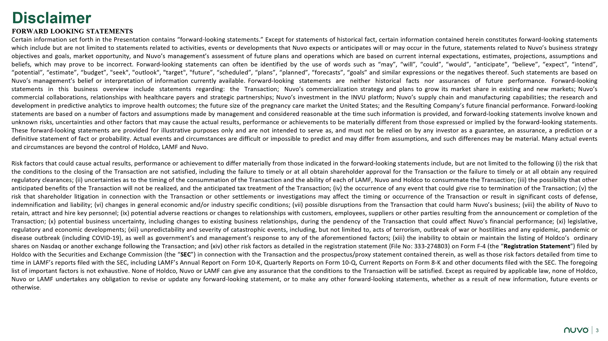 FORWARD LOOKING STATEMENTS Certain information set forth in the Presentation contains “forward - looking statements . ” Except for statements of historical fact, certain information contained herein constitutes forward - looking statements which include but are not limited to statements related to activities, events or developments that Nuvo expects or anticipates will or may occur in the future, statements related to Nuvo’s business strategy objectives and goals, market opportunity, and Nuvo’s management’s assessment of future plans and operations which are based on current internal expectations, estimates, projections, assumptions and beliefs, which may prove to be incorrect . Forward - looking statements can often be identified by the use of words such as “may”, “will”, “could”, “would”, “anticipate”, “believe”, “expect”, “intend”, “potential”, “estimate”, “budget”, "seek", "outlook", "target", "future”, “scheduled”, “plans”, “planned”, “forecasts”, “goals” and similar expressions or the negatives thereof . Such statements are based on Nuvo’s management’s belief or interpretation of information currently available . Forward - looking statements are neither historical facts nor assurances of future performance . Forward - looking statements in this business overview include statements regarding : the Transaction ; Nuvo’s commercialization strategy and plans to grow its market share in existing and new markets ; Nuvo’s commercial collaborations, relationships with healthcare payers and strategic partnerships ; Nuvo’s investment in the INVU platform ; Nuvo’s supply chain and manufacturing capabilities ; the research and development in predictive analytics to improve health outcomes ; the future size of the pregnancy care market the United States ; and the Resulting Company’s future financial performance . Forward - looking statements are based on a number of factors and assumptions made by management and considered reasonable at the time such information is provided, and forward - looking statements involve known and unknown risks, uncertainties and other factors that may cause the actual results, performance or achievements to be materially different from those expressed or implied by the forward - looking statements . These forward - looking statements are provided for illustrative purposes only and are not intended to serve as, and must not be relied on by any investor as a guarantee, an assurance, a prediction or a definitive statement of fact or probability . Actual events and circumstances are difficult or impossible to predict and may differ from assumptions, and such differences may be material . Many actual events and circumstances are beyond the control of Holdco, LAMF and Nuvo . Risk factors that could cause actual results, performance or achievement to differ materially from those indicated in the forward - looking statements include, but are not limited to the following (i) the risk that the conditions to the closing of the Transaction are not satisfied, including the failure to timely or at all obtain shareholder approval for the Transaction or the failure to timely or at all obtain any required regulatory clearances ; (ii) uncertainties as to the timing of the consummation of the Transaction and the ability of each of LAMF , Nuvo and Holdco to consummate the Transaction ; (iii) the possibility that other anticipated benefits of the Transaction will not be realized, and the anticipated tax treatment of the Transaction ; (iv) the occurrence of any event that could give rise to termination of the Transaction ; (v) the risk that shareholder litigation in connection with the Transaction or other settlements or investigations may affect the timing or occurrence of the Transaction or result in significant costs of defense, indemnification and liability ; (vi) changes in general economic and/or industry specific conditions ; (vii) possible disruptions from the Transaction that could harm Nuvo’s business ; (viii) the ability of Nuvo to retain, attract and hire key personnel ; (ix) potential adverse reactions or changes to relationships with customers, employees, suppliers or other parties resulting from the announcement or completion of the Transaction ; (x) potential business uncertainty, including changes to existing business relationships, during the pendency of the Transaction that could affect Nuvo’s financial performance ; (xi) legislative, regulatory and economic developments ; (xii) unpredictability and severity of catastrophic events, including, but not limited to, acts of terrorism, outbreak of war or hostilities and any epidemic, pandemic or disease outbreak (including COVID - 19 ), as well as government’s and management’s response to any of the aforementioned factors ; (xiii) the inability to obtain or maintain the listing of Holdco’s ordinary shares on Nasdaq or another exchange following the Transaction ; and (xiv) other risk factors as detailed in the registration statement (File No : 333 - 274803 ) on Form F - 4 (the “ Registration Statement ”) filed by Holdco with the Securities and Exchange Commission (the “ SEC ”) in connection with the Transaction and the prospectus/proxy statement contained therein, as well as those risk factors detailed from time to time in LAMF’s reports filed with the SEC, including LAMF’s Annual Report on Form 10 - K, Quarterly Reports on Form 10 - Q, Current Reports on Form 8 - K and other documents filed with the SEC . The foregoing list of important factors is not exhaustive . None of Holdco, Nuvo or LAMF can give any assurance that the conditions to the Transaction will be satisfied . Except as required by applicable law, none of Holdco, Nuvo or LAMF undertakes any obligation to revise or update any forward - looking statement, or to make any other forward - looking statements, whether as a result of new information, future ev