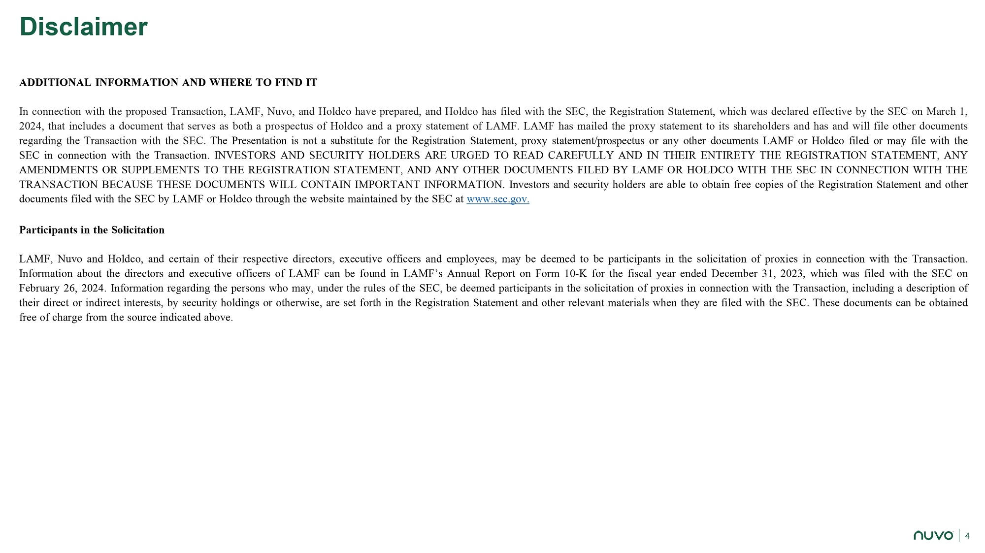 Disclaimer ADDITIONAL INFORMATION AND WHERE TO FIND IT In connection with the proposed Transaction, LAMF, Nuvo, and Holdco have prepared, and Holdco has filed with the SEC, the Registration Statement, which was declared effective by the SEC on March 1 , 2024 , that includes a document that serves as both a prospectus of Holdco and a proxy statement of LAMF . LAMF has mailed the p roxy statement to its shareholders and has and will file other documents regarding the Transaction with the SEC . The Presentation is not a substitute for the Registration Statement, proxy statement/prospectus or any other documents LAMF or Holdco filed or may file with the SEC in connection with the Transaction . INVESTORS AND SECURITY HOLDERS ARE URGED TO READ CAREFULLY AND IN THEIR ENTIRETY THE REGISTRATION STATEMENT, ANY AMENDMENTS OR SUPPLEMENTS TO THE REGISTRATION STATEMENT , AND ANY OTHER DOCUMENTS FILED BY LAMF OR HOLDCO WITH THE SEC IN CONNECTION WITH THE TRANSACTION BECAUSE THESE DOCUMENTS WILL CONTAIN IMPORTANT INFORMATION . Investors and security holders are able to obtain free copies of the Registration Statement and other documents filed with the SEC by LAMF or Holdco through the website maintained by the SEC at www . sec . gov . Participants in the Solicitation LAMF, Nuvo and Holdco, and certain of their respective directors, executive officers and employees, may be deemed to be participants in the solicitation of proxies in connection with the Transaction . Information about the directors and executive officers of LAMF can be found in LAMF’s Annual Report on Form 10 - K for the fiscal year ended December 31 , 2023 , which was filed with the SEC on February 26 , 2024 . Information regarding the persons who may, under the rules of the SEC, be deemed participants in the solicitation of proxies in connection with the Transaction, including a description of their direct or indirect interests, by security holdings or otherwise, are set forth in the Registration Statement and other relevant materials when they are filed with the SEC . These documents can be obtained free of charge from the source indicated above . 4