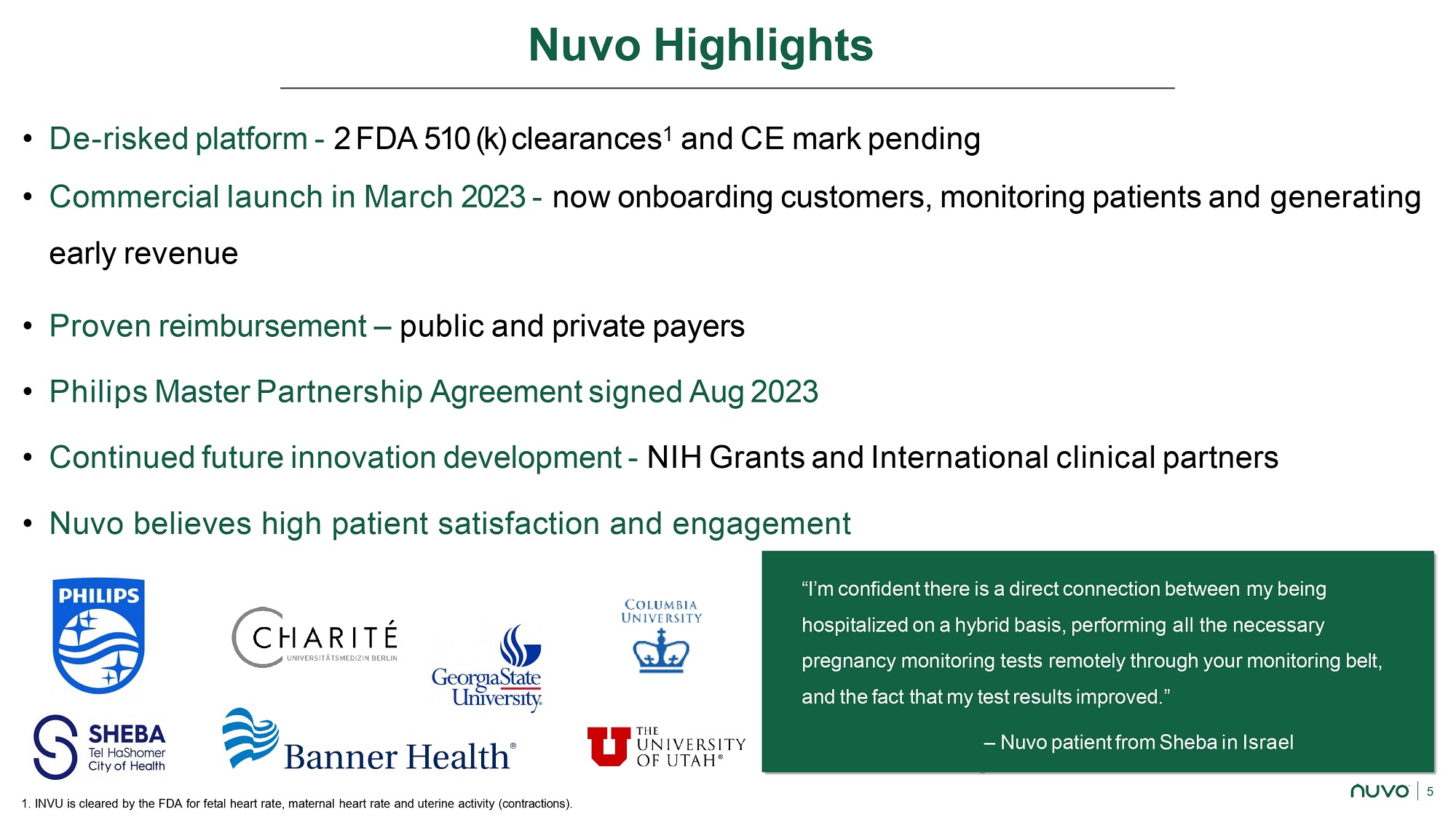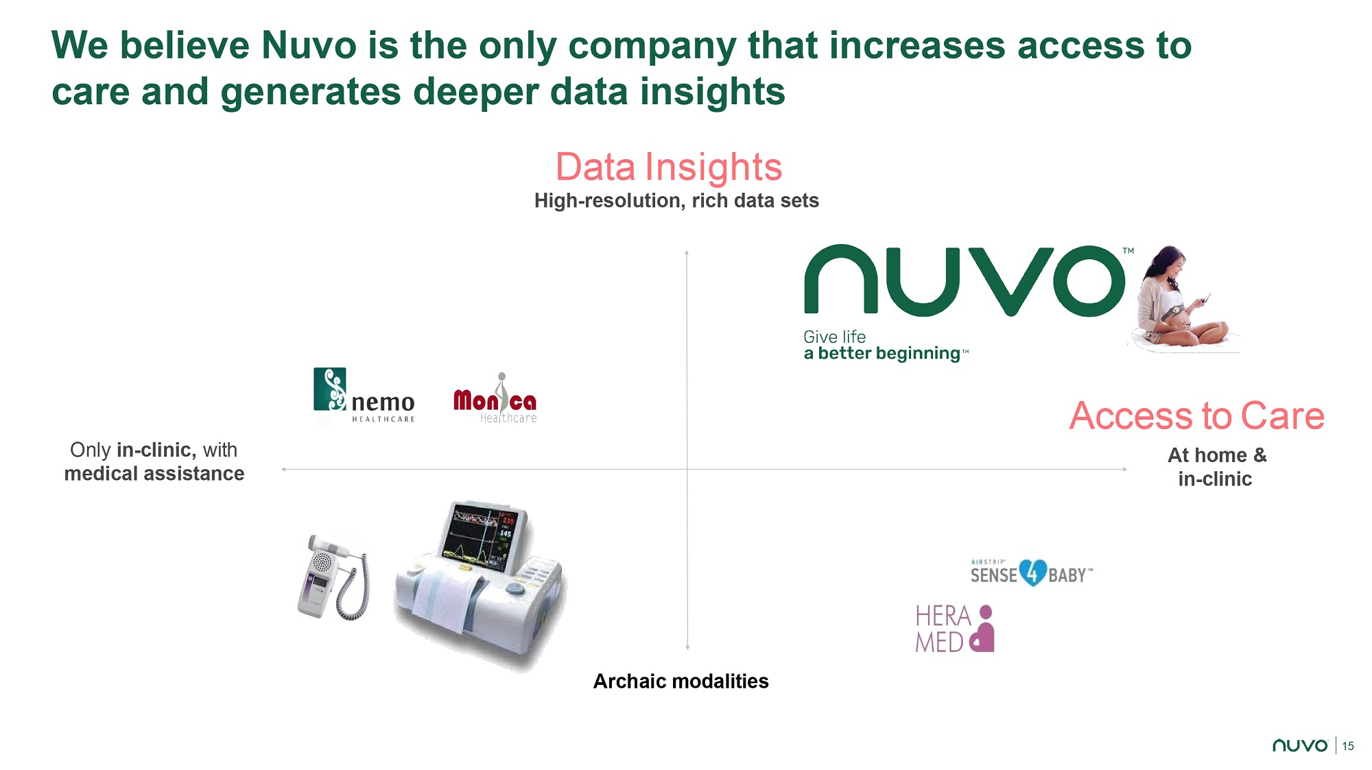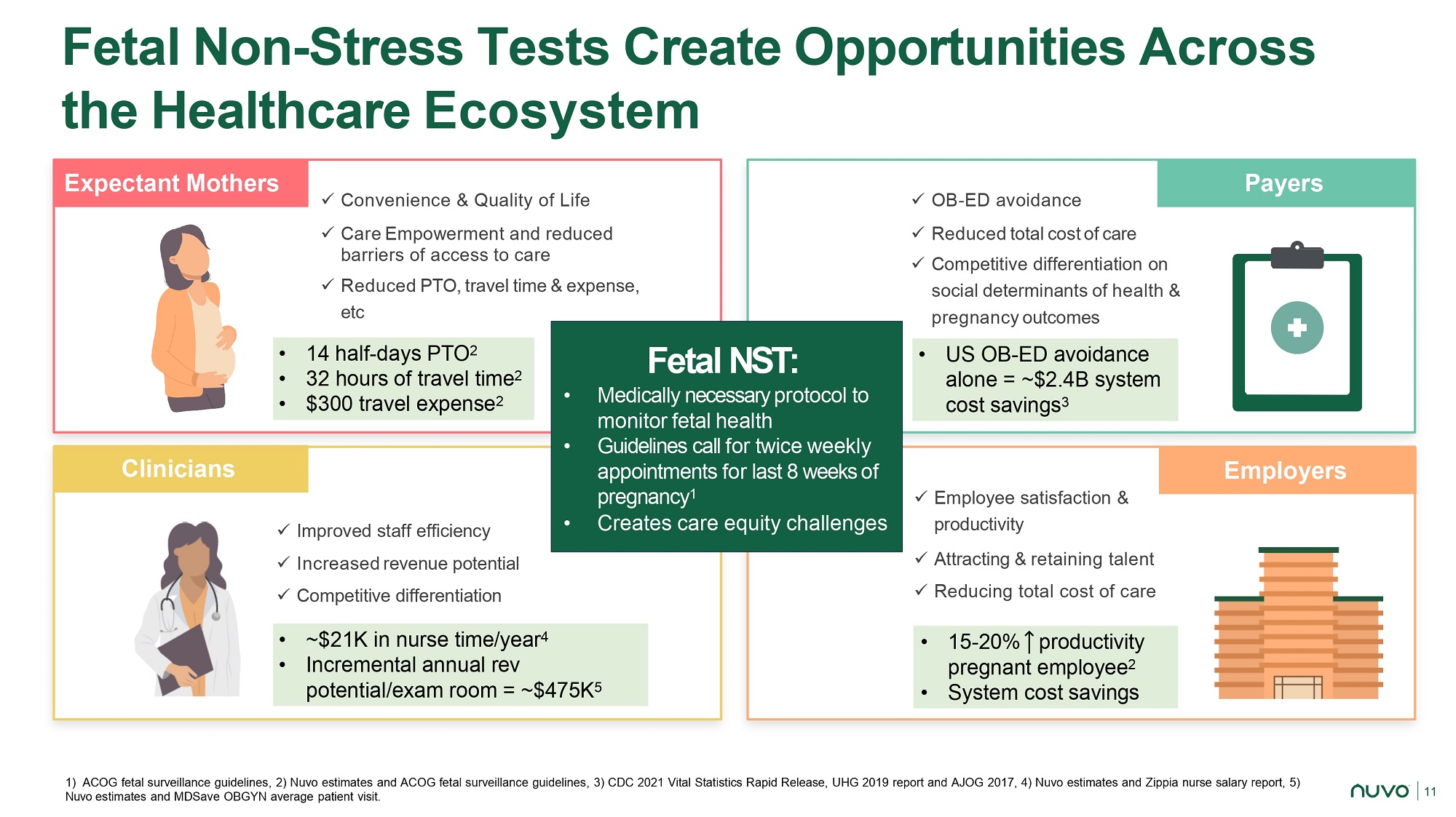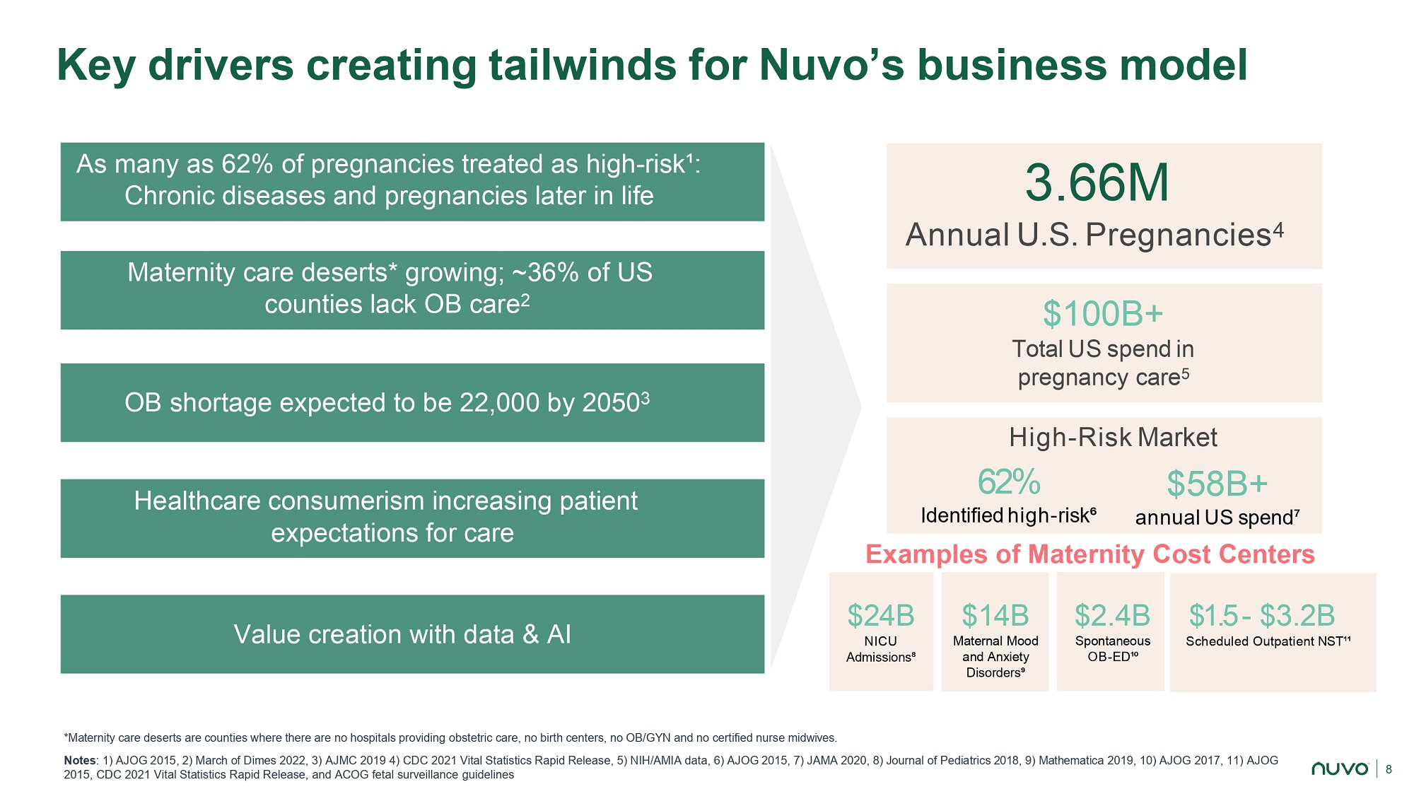 Key drivers creating tailwinds for Nuvo’s business model *Maternity care deserts are counties where there are no hospitals providing obstetric care, no birth centers, no OB/GYN and no certified nurse midwives. Notes : 1) AJOG 2015, 2) March of Dimes 2022 , 3) AJMC 2019 4) CDC 2021 Vital Statistics Rapid Release, 5) NIH/AMIA data, 6) AJOG 2015, 7) JAMA 2020, 8) Journal of Pediatrics 2018, 9) Mathematica 2019, 10) AJOG 2017, 11) AJOG 2015, CDC 2021 Vital Statistics Rapid Release, and ACOG fetal surveillance guidelines As many as 62% of pregnancies treated as high - risk¹: Chronic diseases and pregnancies later in life Healthcare consumerism increasing patient expectations for care Maternity care deserts* growing; ~36% of US counties lack OB care 2 OB shortage expected to be 22,000 by 2050 3 Value creation with data & AI 3.66M Annual U.S. Pregnancies 4 62% Identified high - risk⁶ $100B+ Total US spend in pregnancy care 5 $58B+ annual US spend⁷ High - Risk Market $24B NICU Admissions⁸ $14B Matern al Mood and Anxiety Disorders ⁹ $2.4B Spontaneous OB - ED¹⁰ $1.5 - $3.2B Scheduled Outpatient NST¹¹ Examples of Maternity Cost Centers 8
