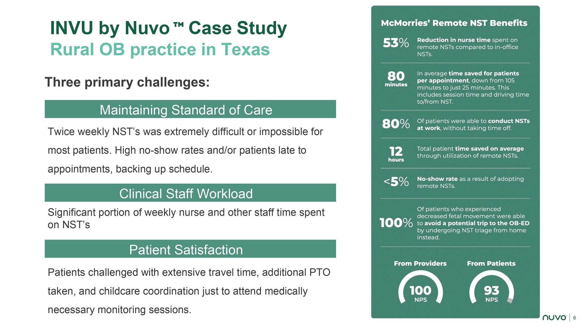 • De - risked platform - 2 FDA 510 (k) clearances 1 and CE mark pending • Commercial launch in March 2023 - now onboarding customers, monitoring patients and generating early revenue • Proven reimbursement – public and private payers • Philips Master Partnership Agreement signed Aug 2023 • Continued future innovation development - NIH Grants and International clinical partners • Nuvo believes high patient satisfaction and engagement Nuvo Highlights 1. INVU is cleared by the FDA for fetal heart rate, maternal heart rate and uterine activity (contractions). “I’m confident there is a direct connection between my being hospitalized on a hybrid basis, performing all the necessary pregnancy monitoring tests remotely through your monitoring belt, and the fact that my test results improved.” – Nuvo patient from Sheba in Israel 5