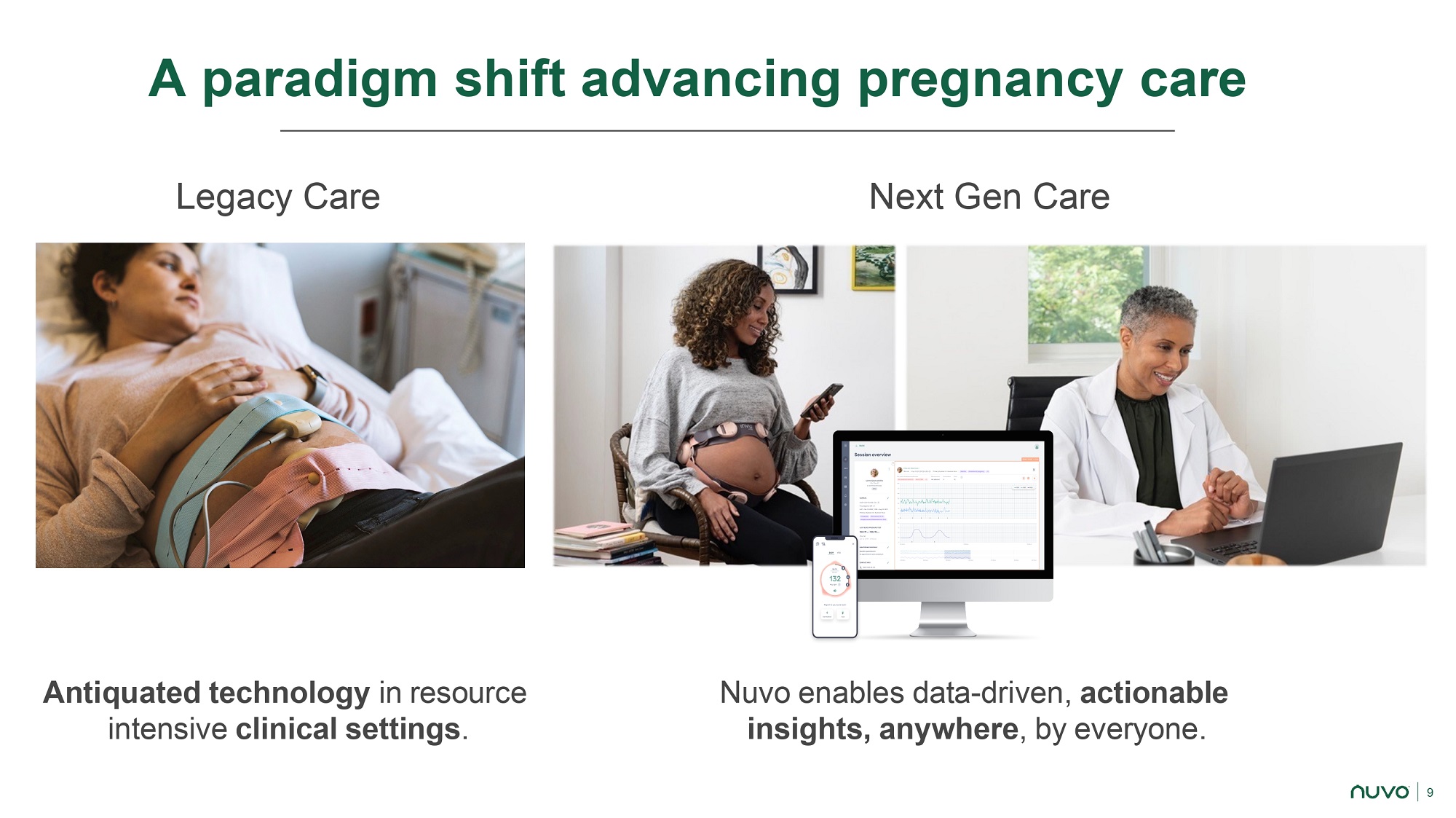 A paradigm shift advancing pregnancy care Antiquated technology in resource intensive clinical settings . Nuvo enables data - driven, actionable insights, anywhere , by everyone. Legacy Care Next Gen Care 9