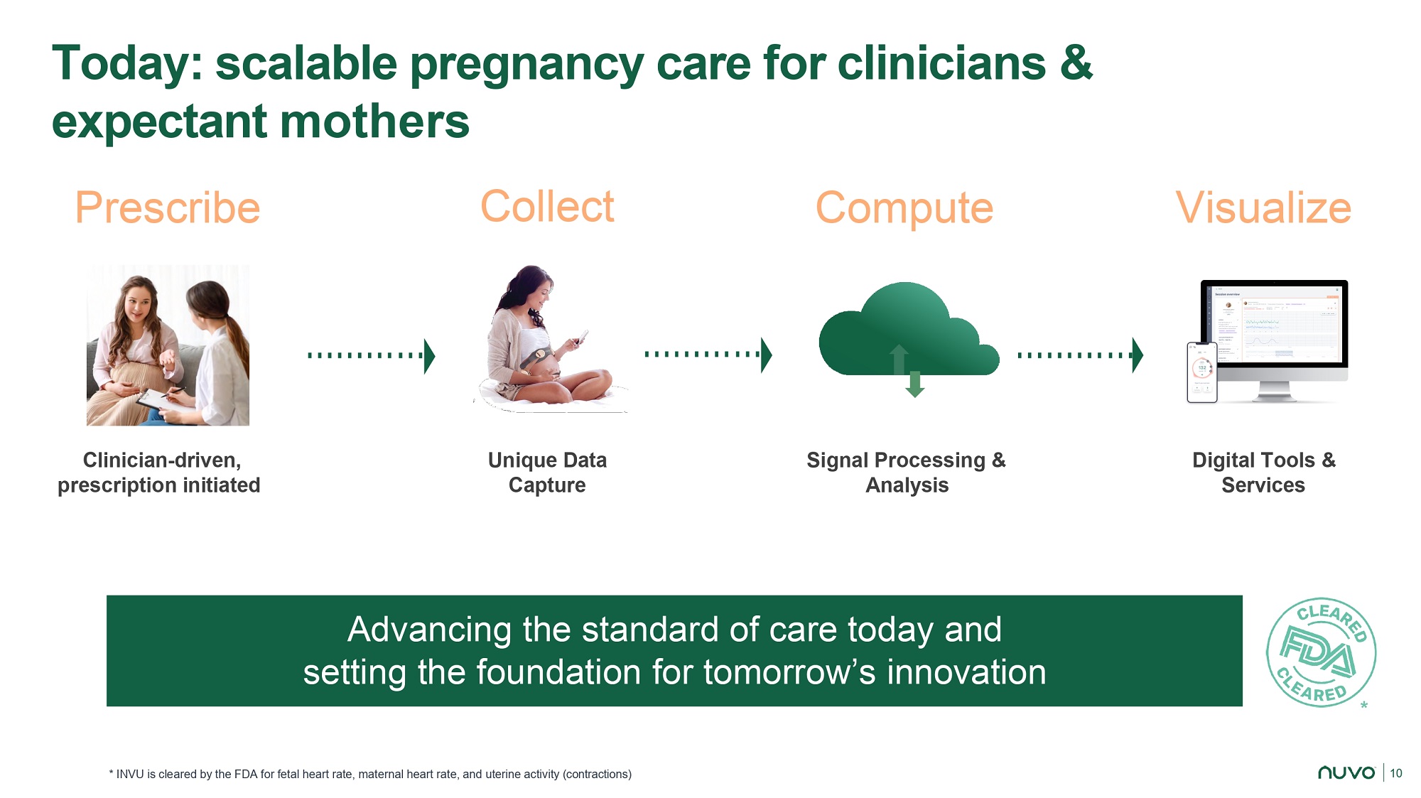 Today: scalable pregnancy care for clinicians & expectant mothers Unique Data Capture Signal Processing & Analysis Digital Tools & Services Collect Prescribe Compute Visualize Clinician - driven, prescription initiated Advancing the standard of care today and setting the foundation for tomorrow’s innovation * INVU is cleared by the FDA for fetal heart rate, maternal heart rate, and uterine activity (contractions) * 10