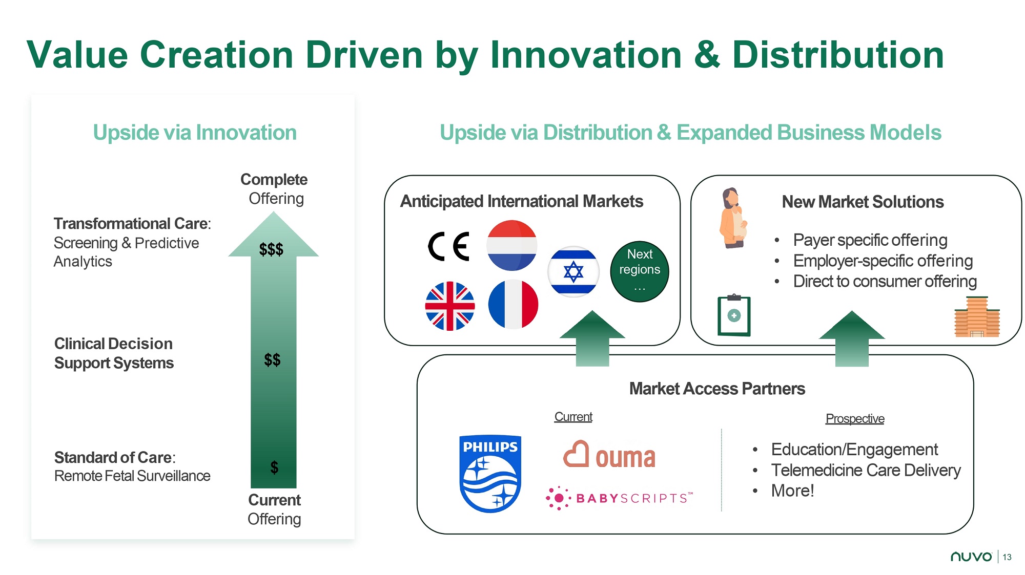 Fetal Non - Stress Tests Create Opportunities Across the Healthcare Ecosystem x Convenience & Quality of Life x Care Empowerment and reduced barriers of access to care x Reduced PTO, travel time & expense, etc x Improved staff efficiency x Increased revenue potential x Competitive differentiation x OB - ED avoidance x Reduced total cost of care x Competitive differentiation on social determinants of health & pregnancy outcomes x Employee satisfaction & productivity x Attracting & retaining talent x Reducing total cost of care Expectant Mothers Payers Clinicians Employers Fetal NST: • Medically necessary protocol to monitor fetal health • Guidelines call for twice weekly appointments for last 8 weeks of pregnancy 1 • Creates care equity challenges • 14 half - days PTO 2 • 32 hours of travel time 2 • $ 300 travel expense 2 • ~$21K in nurse time/year 4 • Incremental annual rev potential/exam room = ~$475K 5 • US OB - ED avoidance alone = ~$2.4B system cost savings 3 • 15 - 20% productivity pregnant employee 2 • System cost savings 1) ACOG fetal surveillance guidelines, 2) Nuvo estimates and ACOG fetal surveillance guidelines, 3) CDC 2021 Vital Statistics Rapid Release, UHG 2019 report and AJOG 2017, 4) Nuvo estimates and Zippia nurse salary report, 5) Nuvo estimates and MDSave OBGYN average patient visit. 11