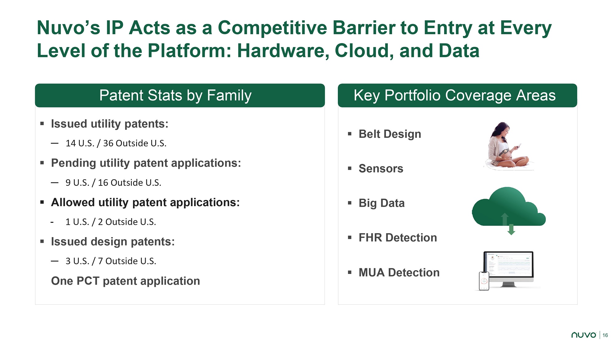 Only in - clinic, with medical assistance Access to Care At home & in - clinic Data Insights High - resolution, rich data sets We believe Nuvo is the only company that increases access to care and generates deeper data insights Archaic modalities 15