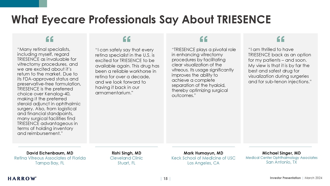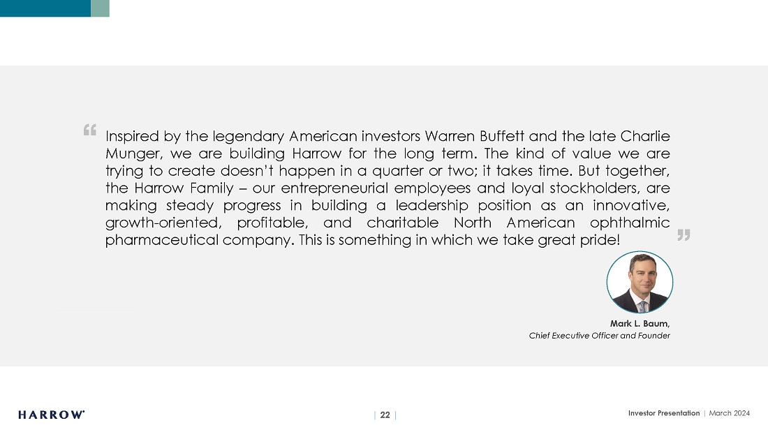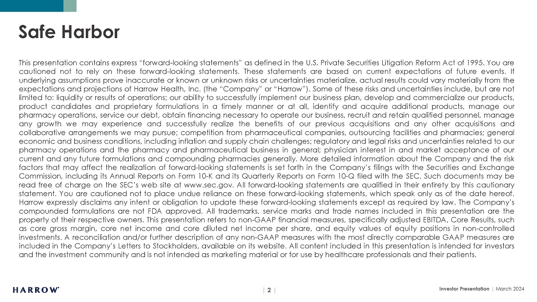 Harrow’s results may differ materially from those projected. Harrow disclaims any intention or obligation to update or revise any financial projections or forward-looking statements whether because of new information, future events or otherwise. This stockholder letter contains time-sensitive information and is accurate only as of today.