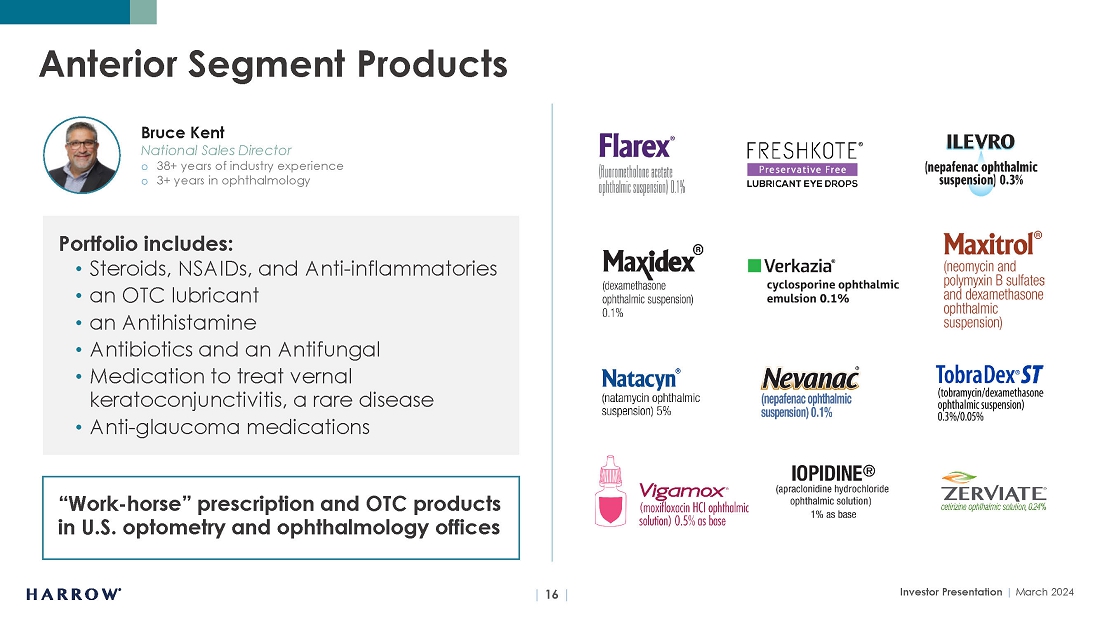 During the fourth quarter, Harrow completed the transfer of new drug applications (NDAs) for FLAREX®, NATACYN®, TOBRADEX® ST, VERKAZIA®, and ZERVIATE®, products that we purchased in July of 2023.