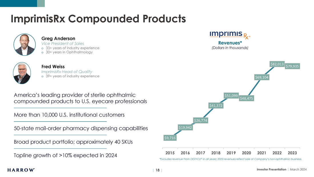 I also want to mention innovation within our ImprimisRx business because product innovation and our uncompromising commitment to quality are how ImprimisRx became the U.S. ophthalmic compounding leader – and how we will remain on top and even extend our leadership position. For example, this summer, we expect to make repackaged Vigamox® (moxifloxacin hydrochloride (moxifloxacin HCl) ophthalmic solution 0.5%), one of our branded products, available through ImprimisRx – in a vial for injection. This will be an exciting new compounded product for U.S. ophthalmologists who overwhelmingly choose to use moxifloxacin HCI in more than 2 million intracameral injections during eye surgery. Additionally, we are expanding our Fortisite franchise with new lower-concentration fortified antibiotics formulations (based on our proprietary ability to manufacture refrigeration-stable fortified antibiotics). Finally, we continue to see market-share gains in our compounded atropine business based on proprietary preservative-free and buffer-free formulations. For these reasons and others, I am confident that revenues from our ImprimisRx business should increase by 10% or more in 2024, with increasing gross margins from last year.