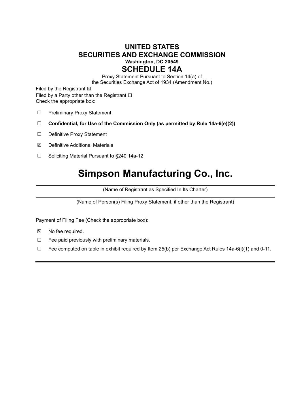 UNITED STATES SECURITIES AND EXCHANGE COMMISSION Washington, DC 20549 SCHEDULE 14A Proxy Statement Pursuant to Section 14(a) of the Securities Exchange Act of 1934 (Amendment No.) Filed by the Registrant ☒ Filed by a Party other than the Registrant ☐ Check the appropriate box: ☐ Preliminary Proxy Statement ☐ Confidential, for Use of the Commission Only (as permitted by Rule 14a-6(e)(2)) ☐ Definitive Proxy Statement ☒ Definitive Additional Materials ☐ Soliciting Material Pursuant to §240.14a-12 Simpson Manufacturing Co., Inc. (Name of Registrant as Specified In Its Charter) (Name of Person(s) Filing Proxy Statement, if other than the Registrant) Payment of Filing Fee (Check the appropriate box): ☒ No fee required. ☐ Fee paid previously with preliminary materials. ☐ Fee computed on table in exhibit required by Item 25(b) per Exchange Act Rules 14a-6(i)(1) and 0-11.